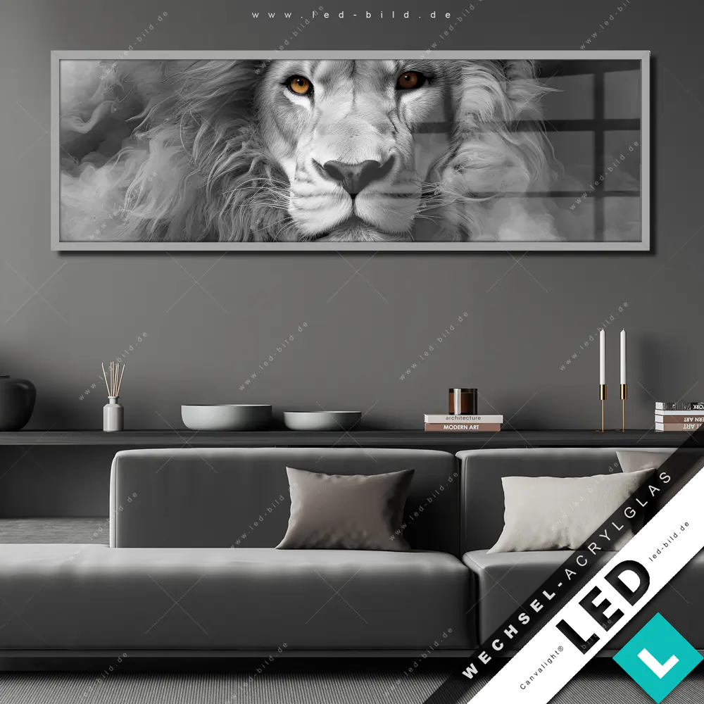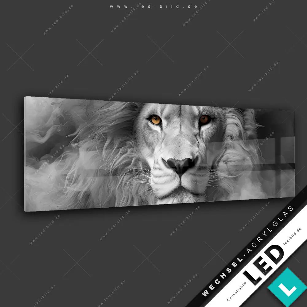 Canvalight® Wechsel-Acrylglas | Löwengesicht in Rauch | Panorama