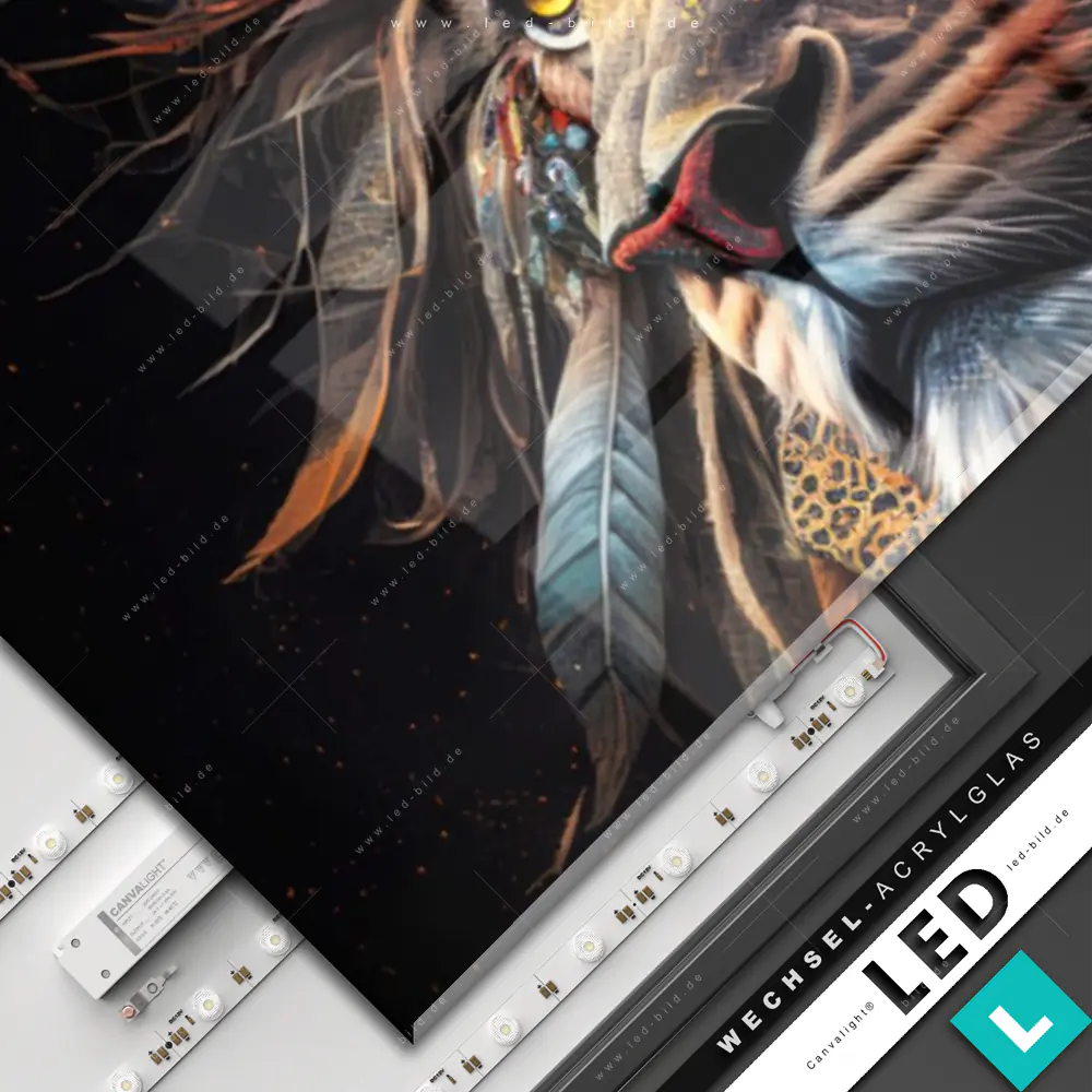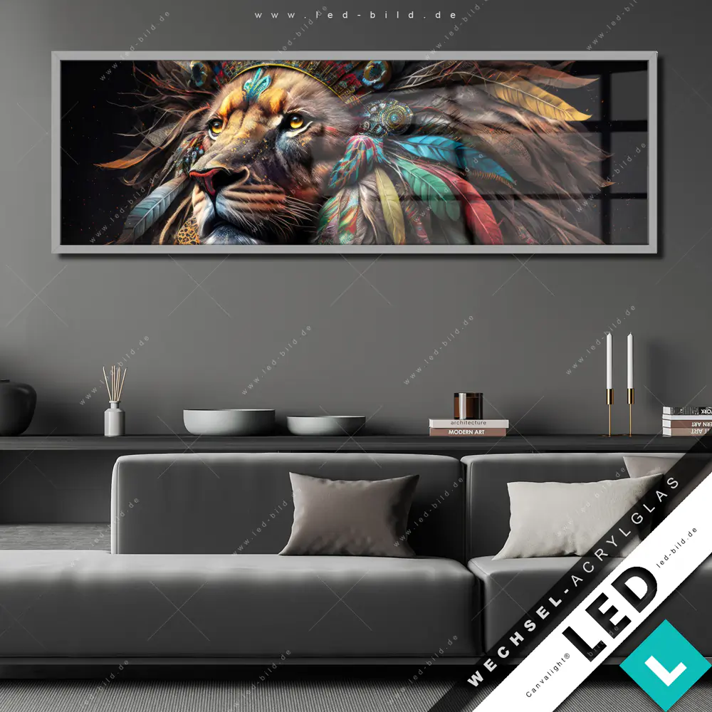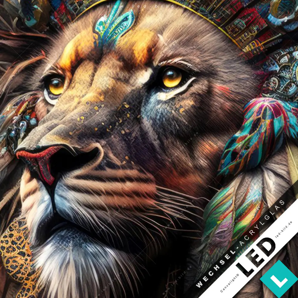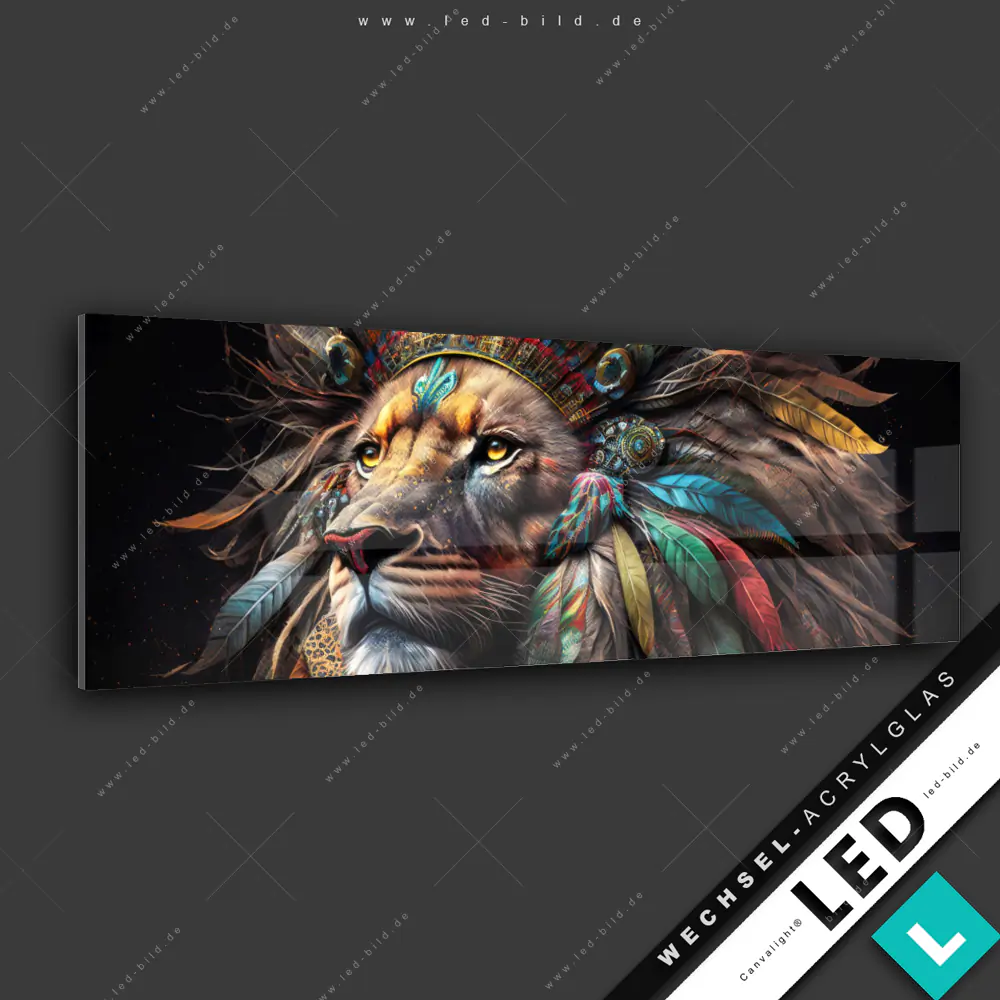 Canvalight® Wechsel-Acrylglas | Löwenkopf mit bunten Federn | Panorama