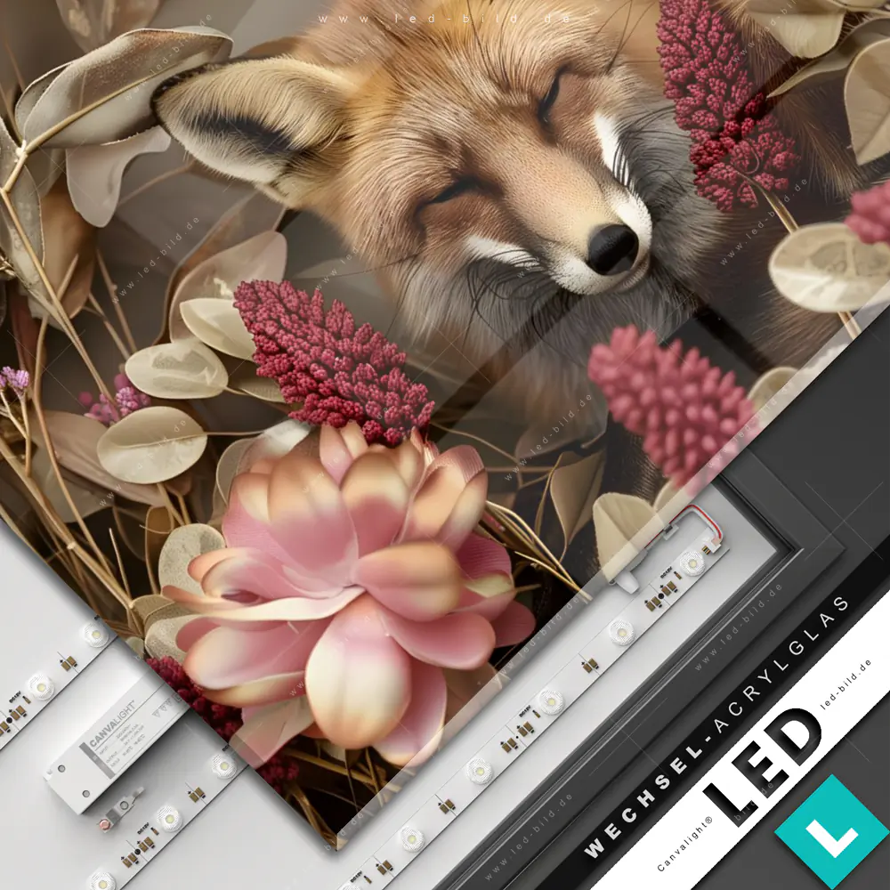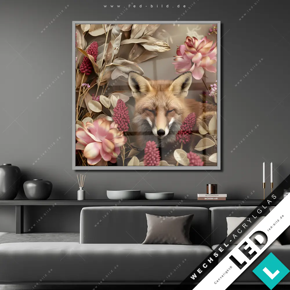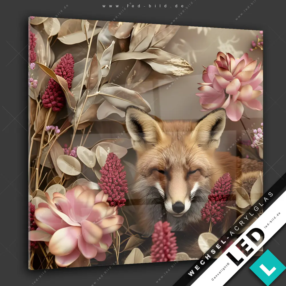Canvalight® Wechsel-Acrylglas | Naturbild Fuchs und Blumen | Quadrat