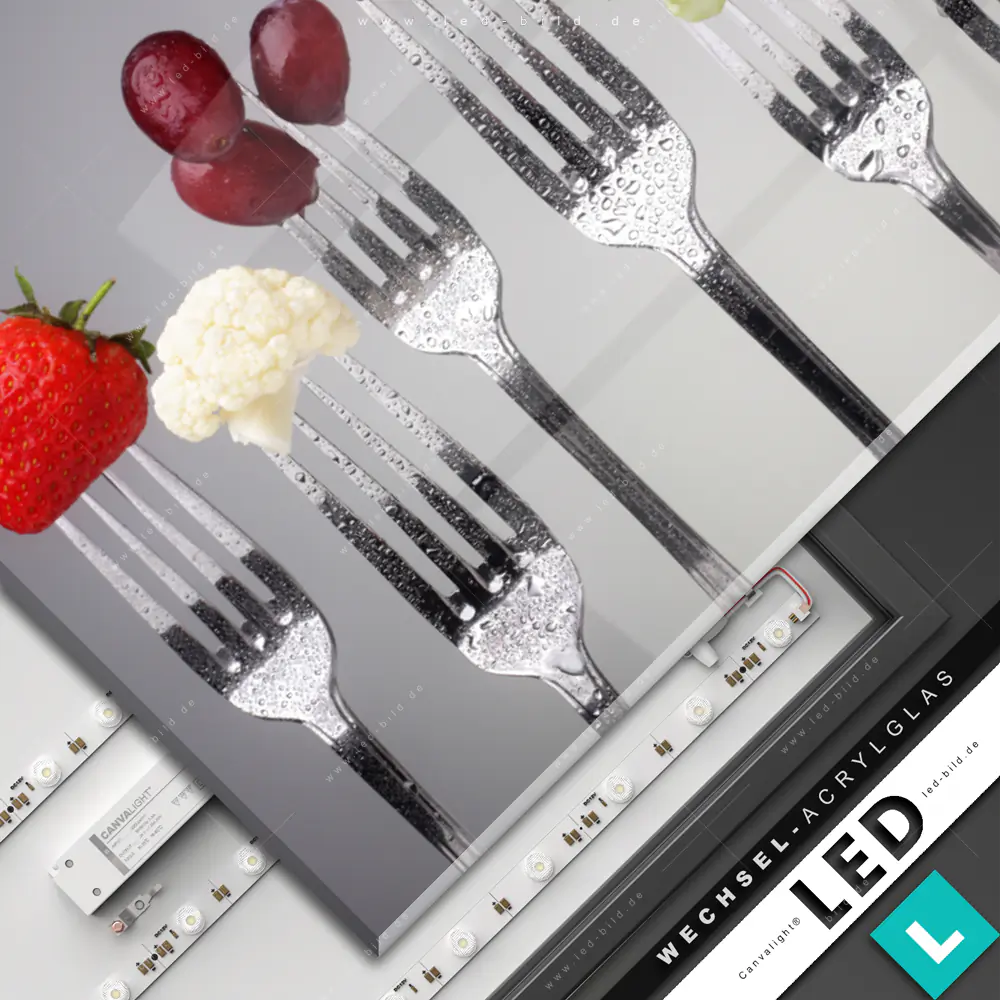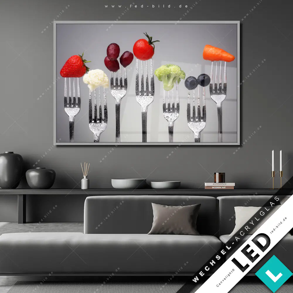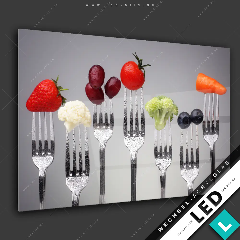Canvalight® Wechsel-Acrylglas | Obst & Gemüse auf Gabeln | Querformat