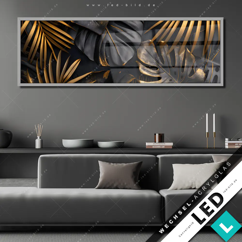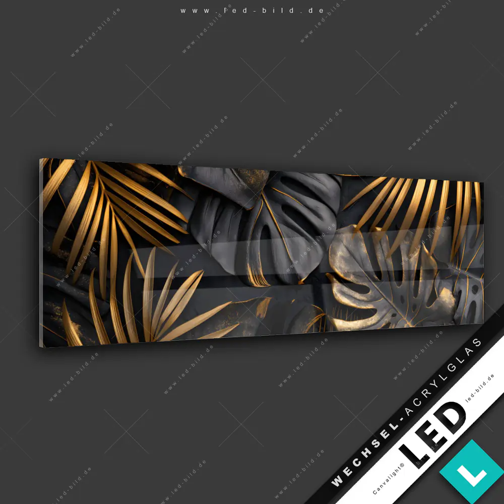Canvalight® Wechsel-Acrylglas | Palmenblätter Schwarz Gold | Panorama