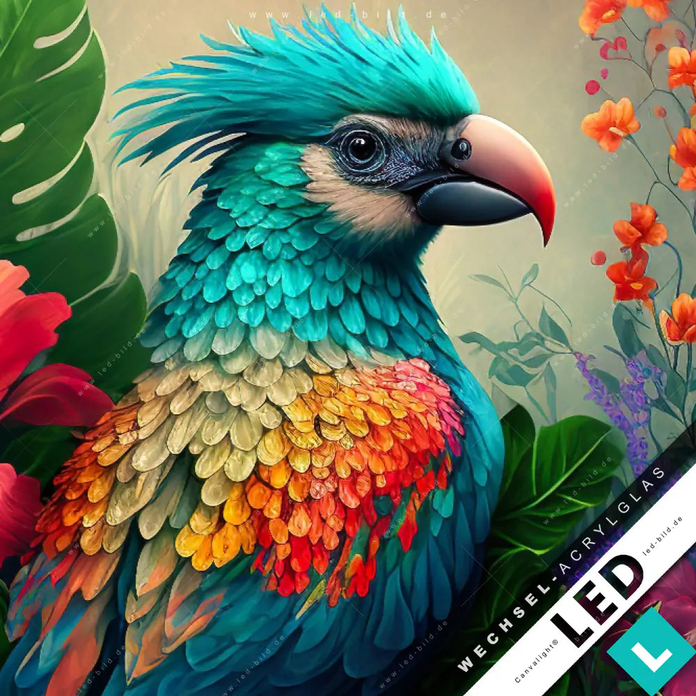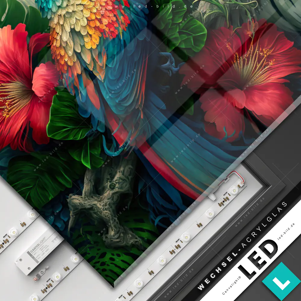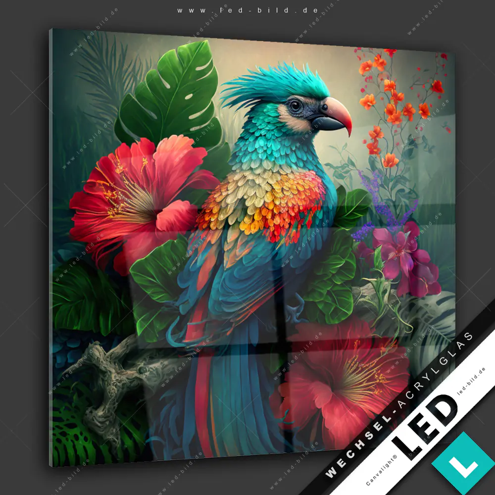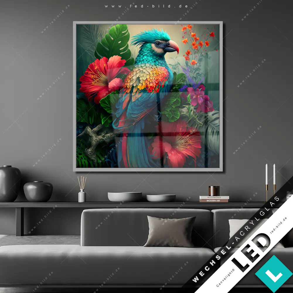 Canvalight® Wechsel-Acrylglas | Papagei und tropischer Hibiskus | Quadrat
