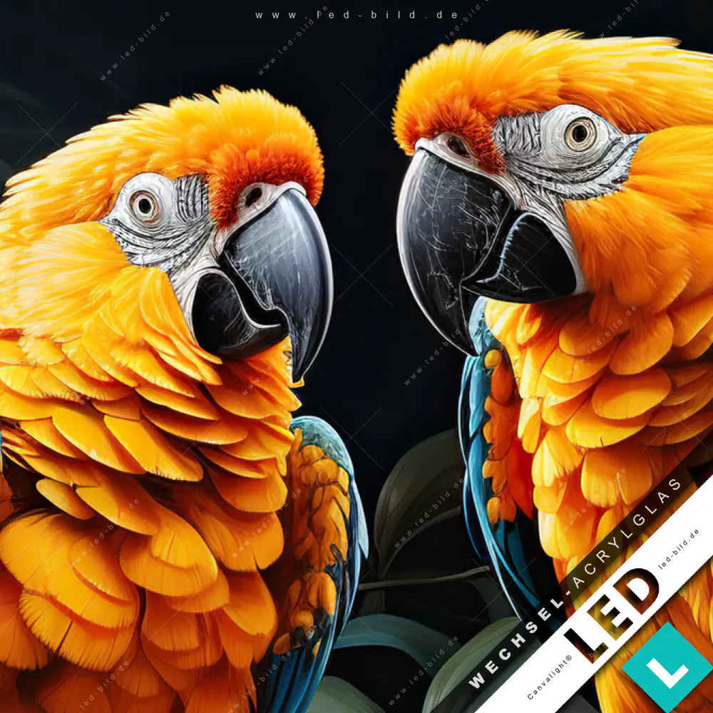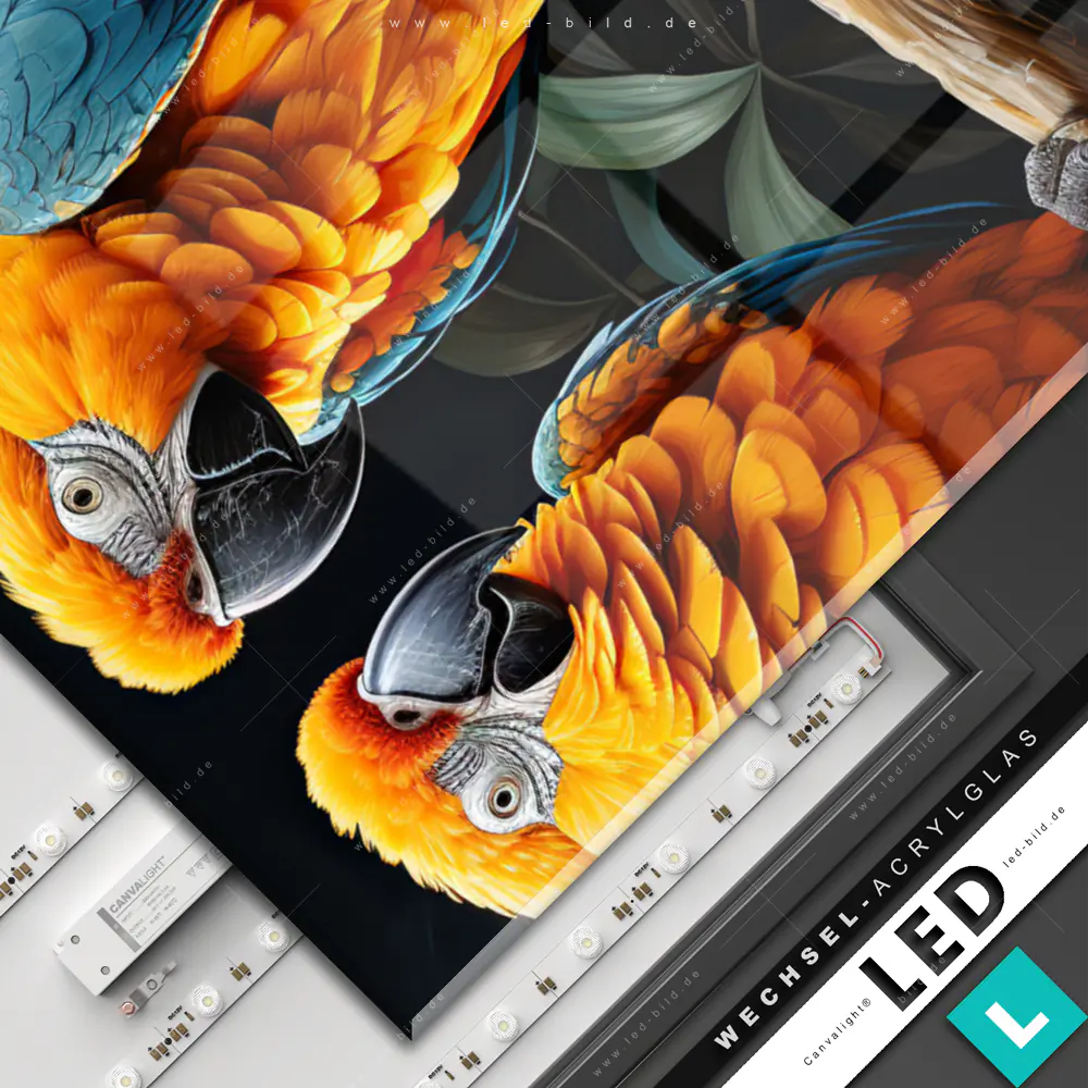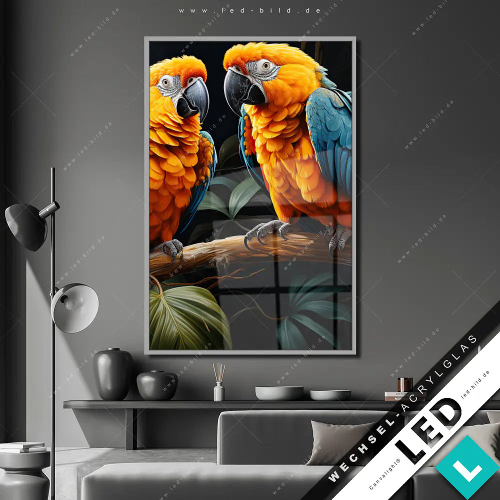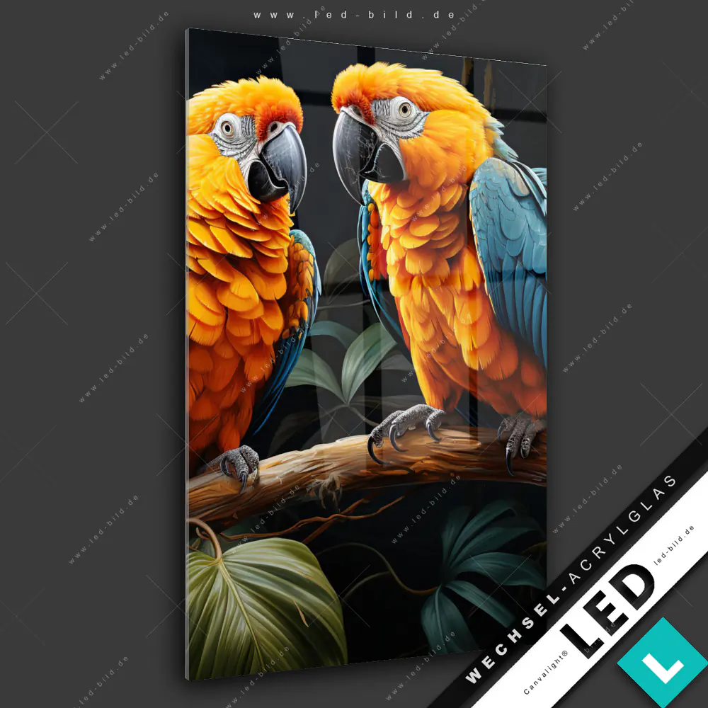 Canvalight® Wechsel-Acrylglas | Papageien auf einem Ast | Hochformat