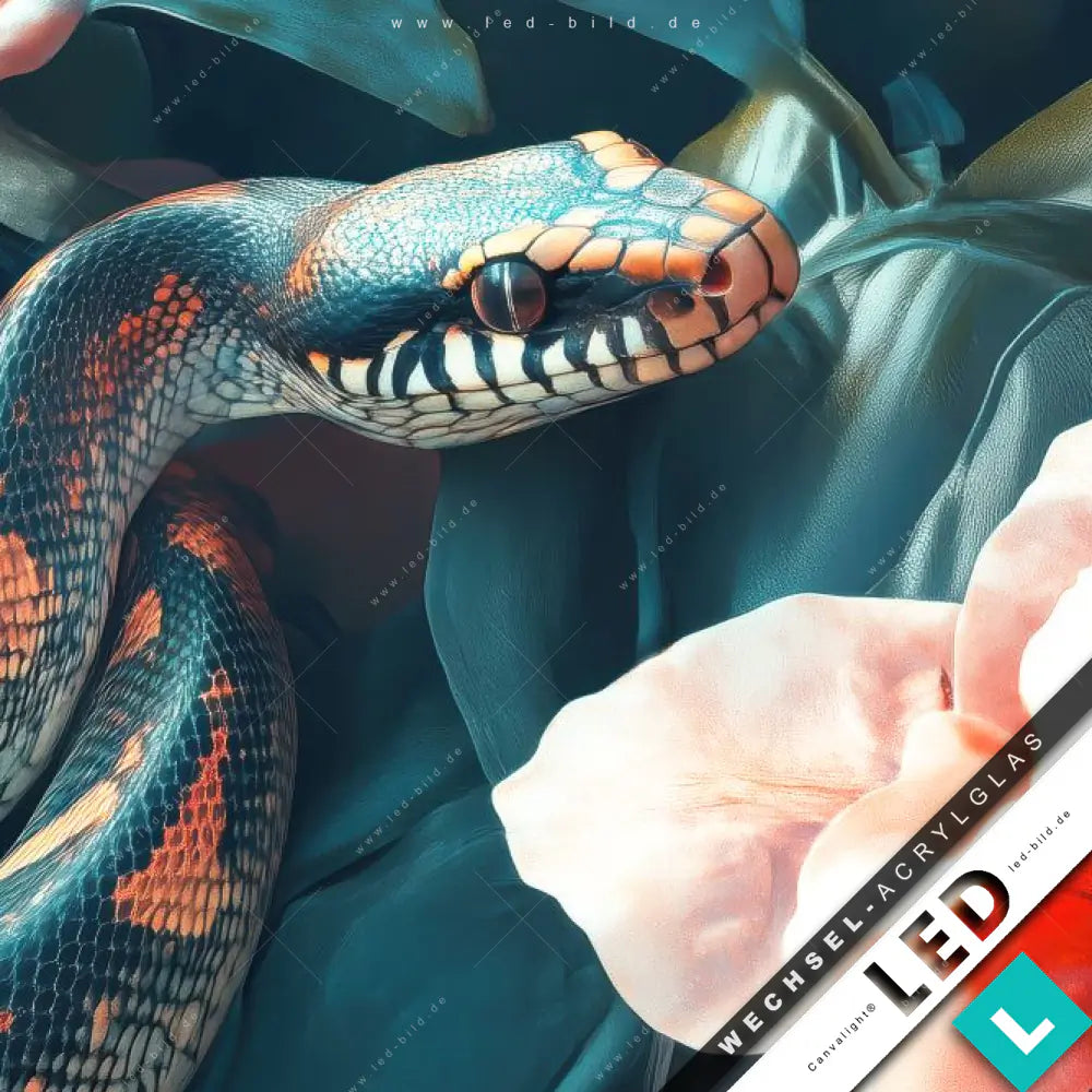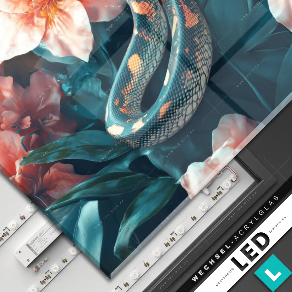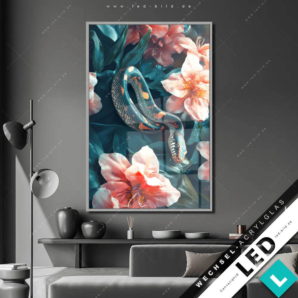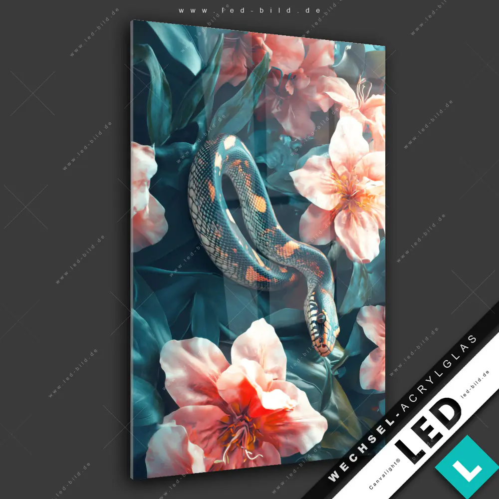 Canvalight® Wechsel-Acrylglas | Schlange zwischen großen Blüten | Hochformat