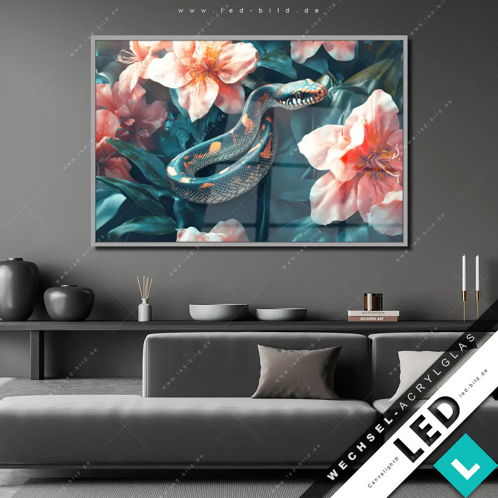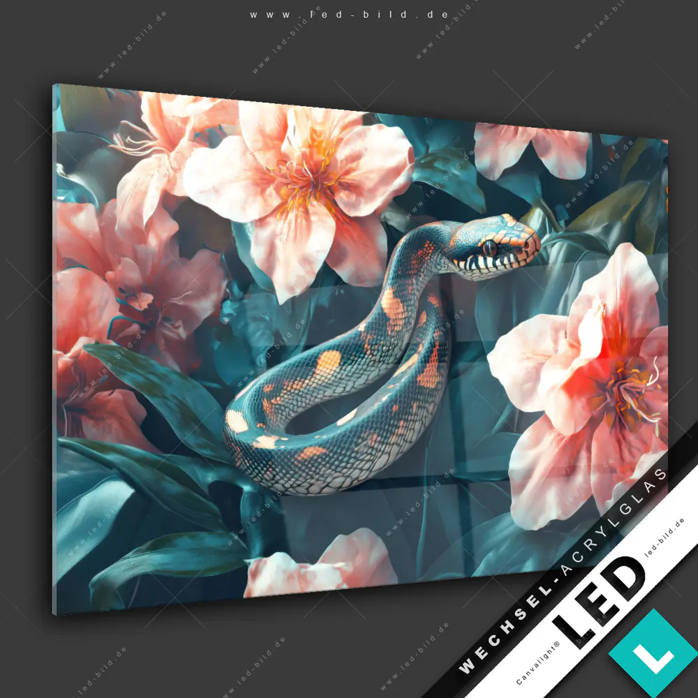 Canvalight® Wechsel-Acrylglas | Schlange zwischen großen Blüten | Querformat