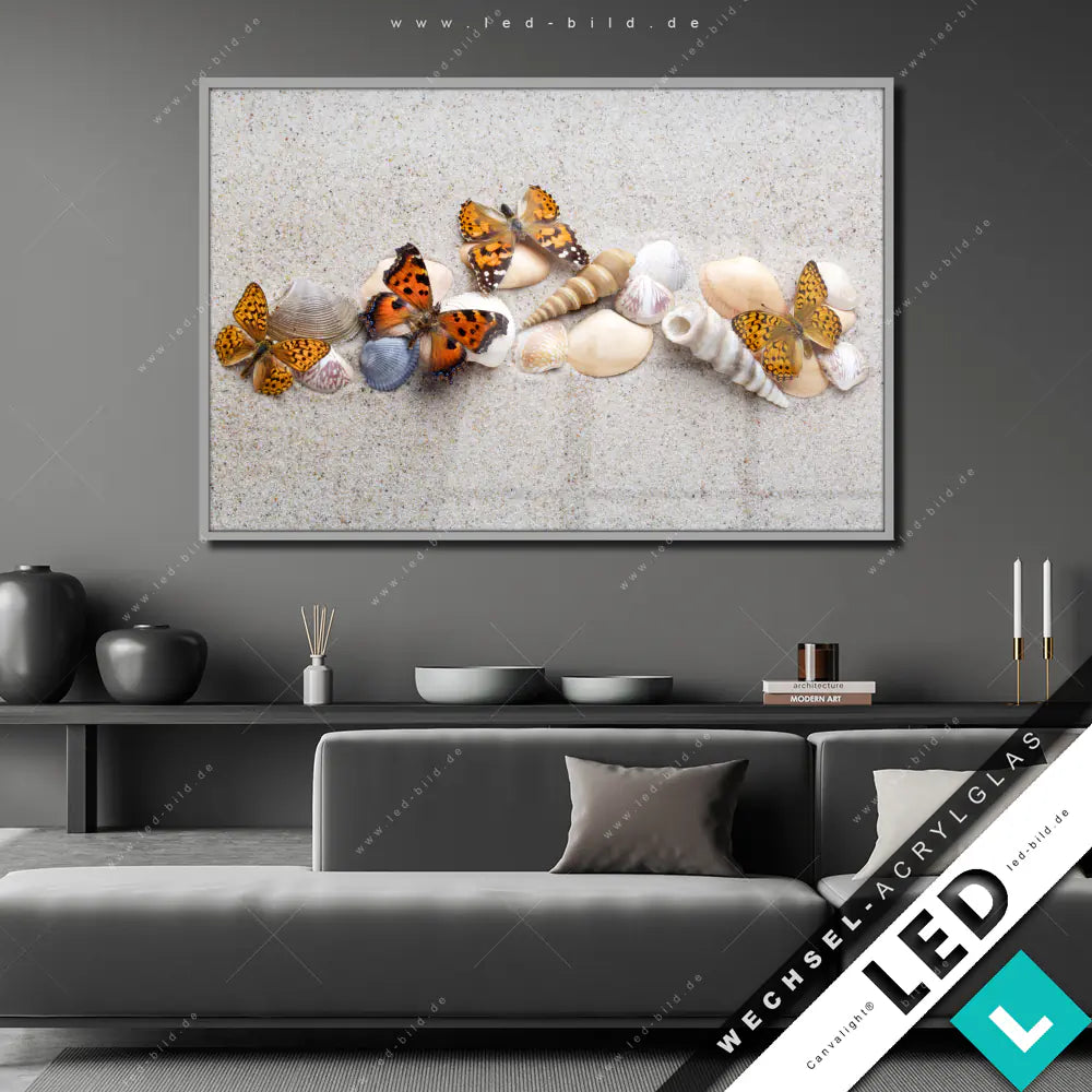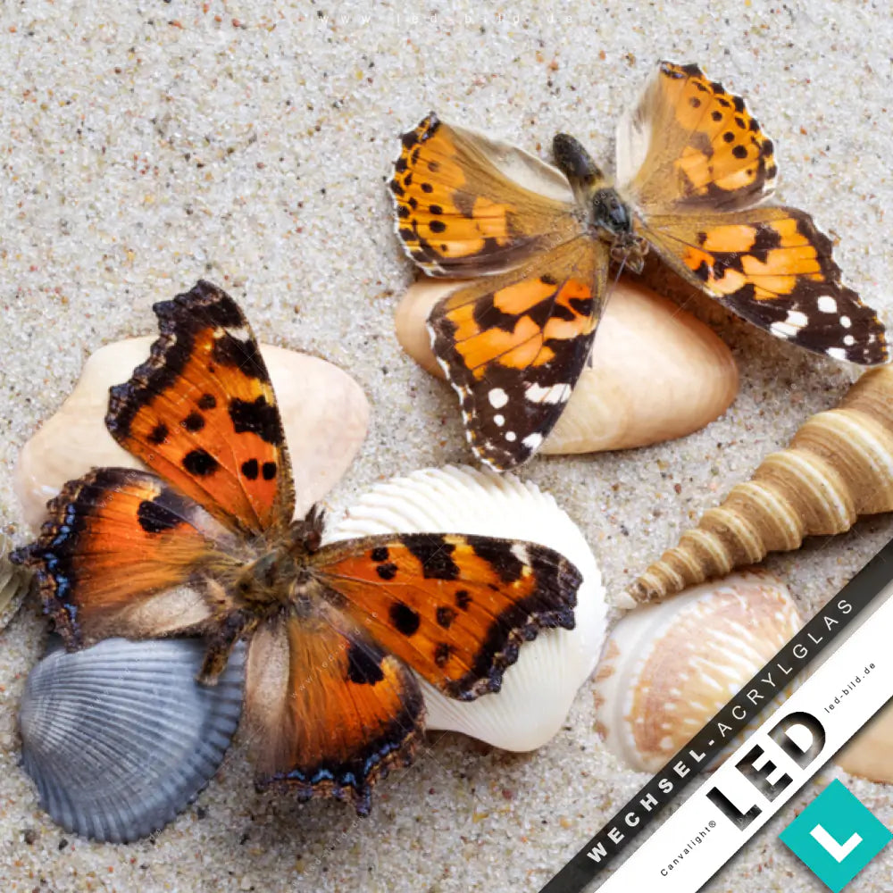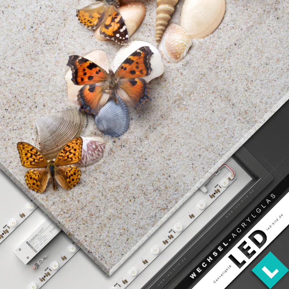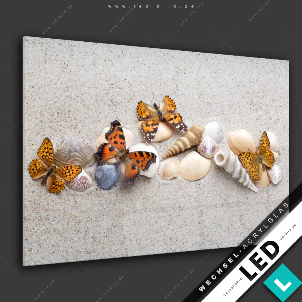 Canvalight® Wechsel-Acrylglas | Schmetterlinge & Muscheln im Sand | Querformat