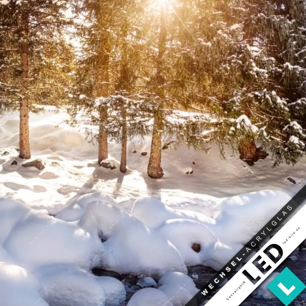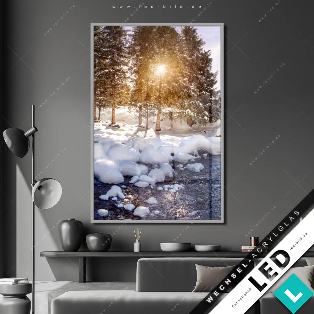 Canvalight® Wechsel-Acrylglas | Schneebedeckte Landschaft am Fluss | Hochformat