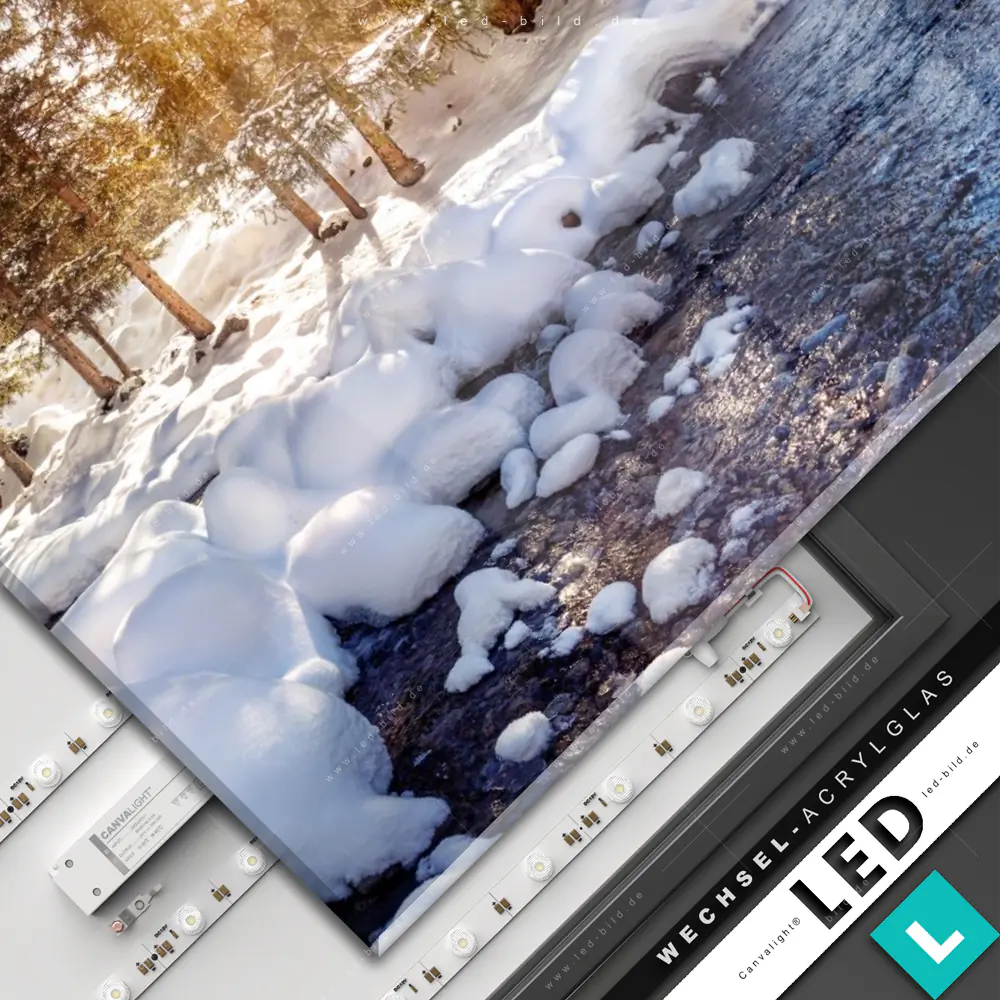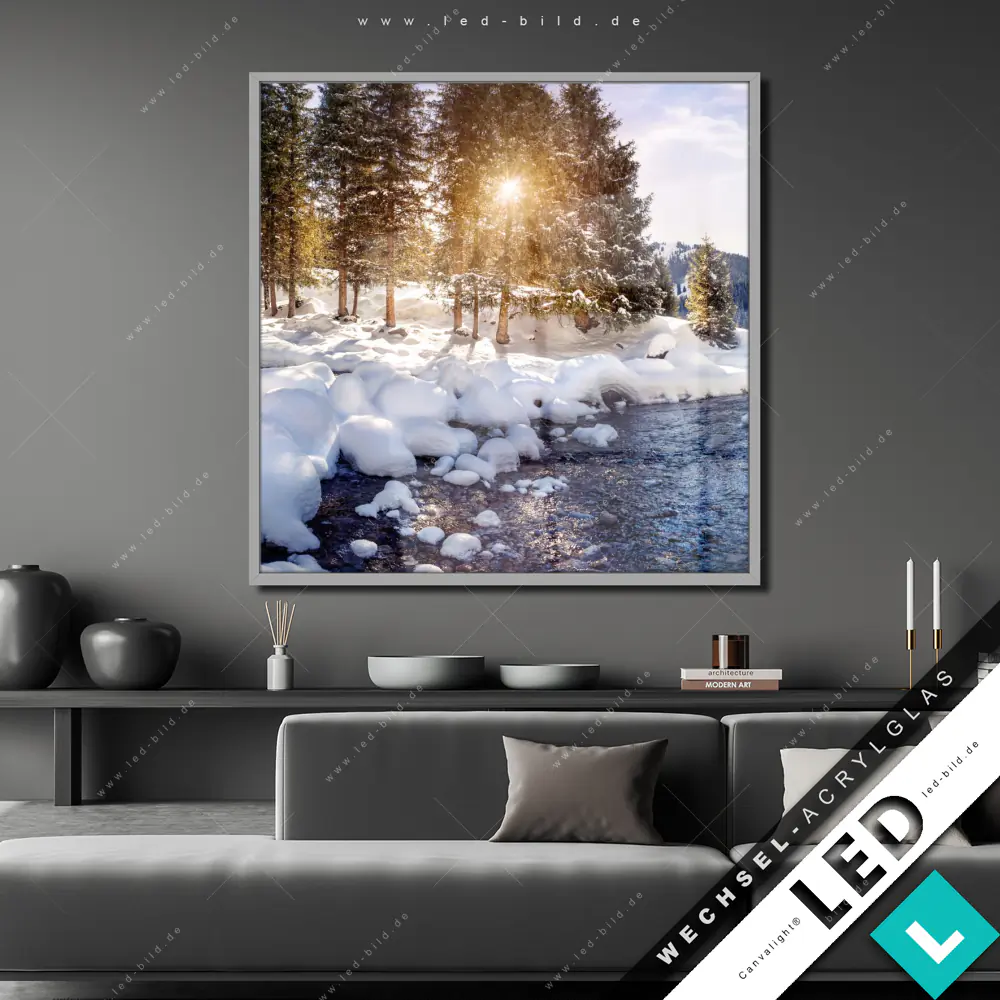 Canvalight® Wechsel-Acrylglas | Schneebedeckte Landschaft am Fluss | Quadrat