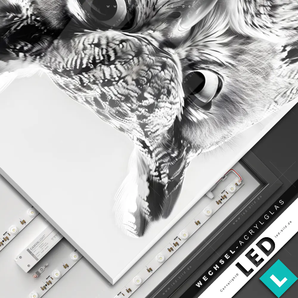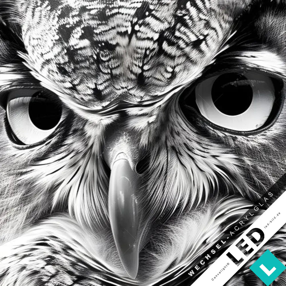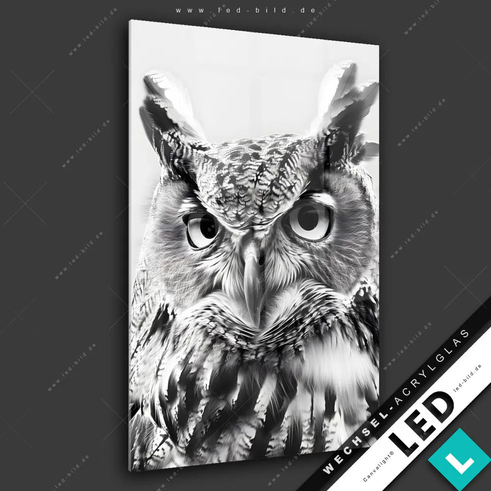 Canvalight® Wechsel-Acrylglas | Schwarz-Weiß Eulenportrait | Hochformat