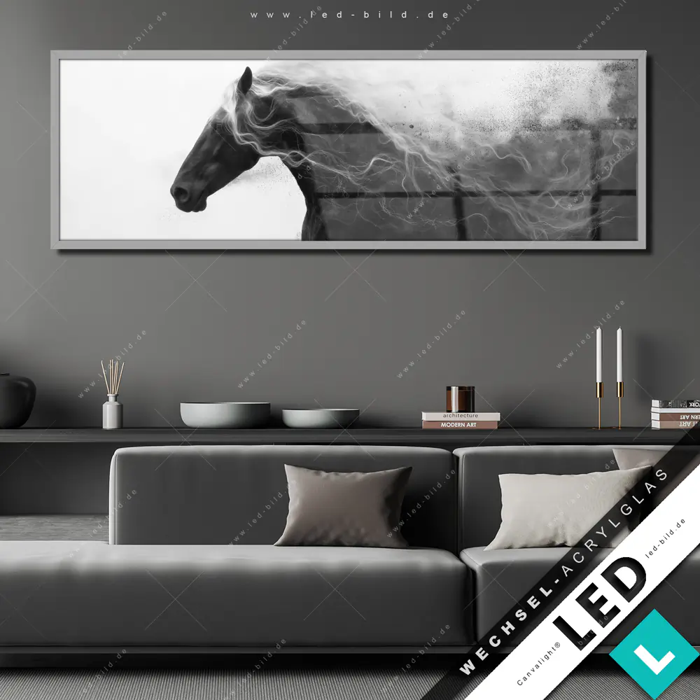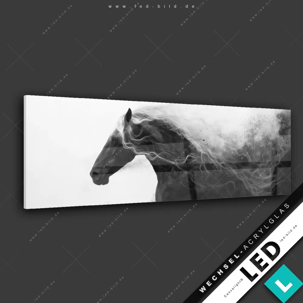 Canvalight® Wechsel-Acrylglas | Schwarzes Pferd voller Energie | Panorama