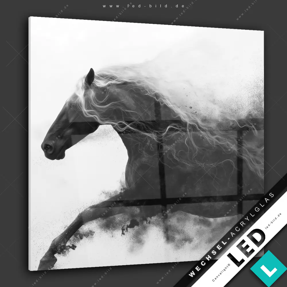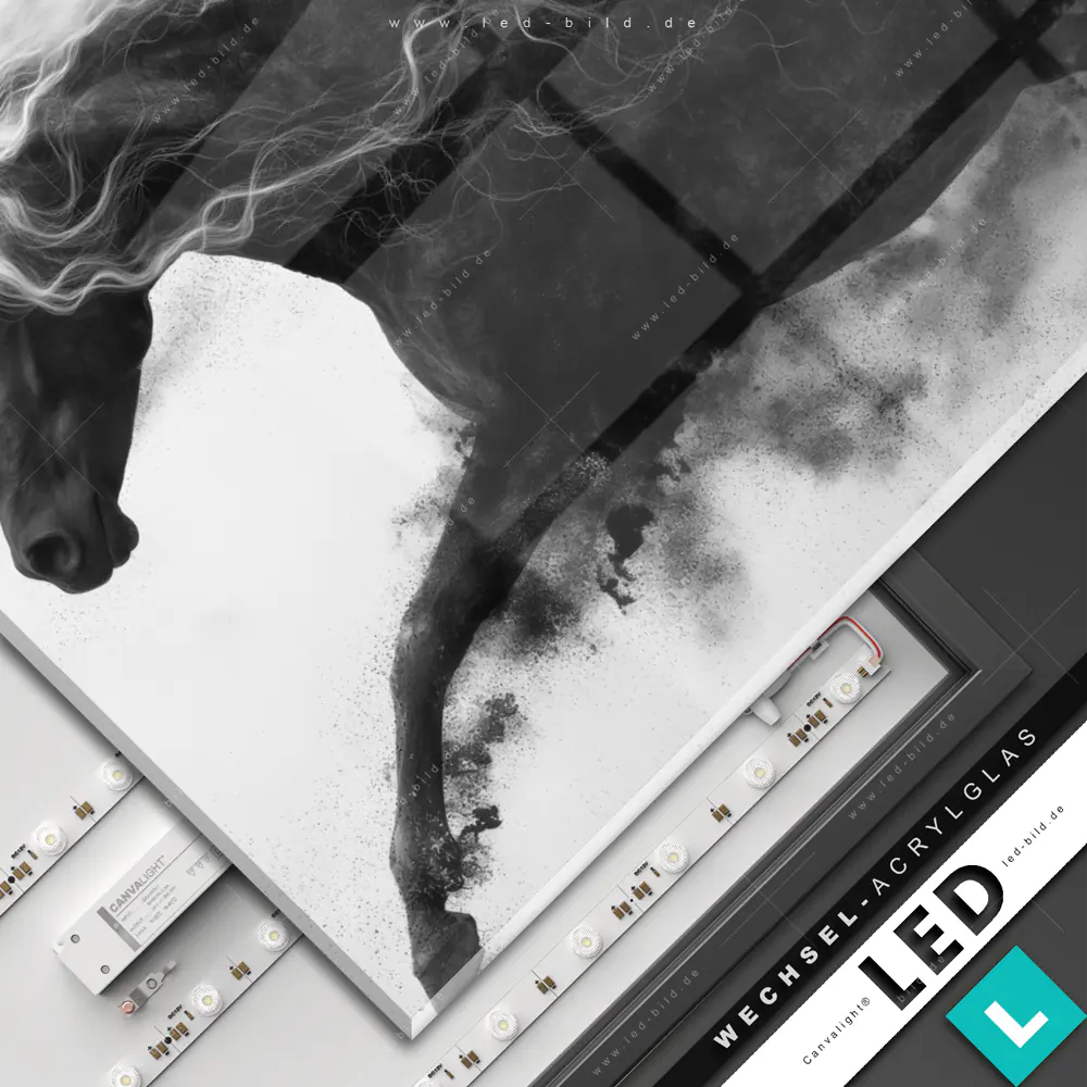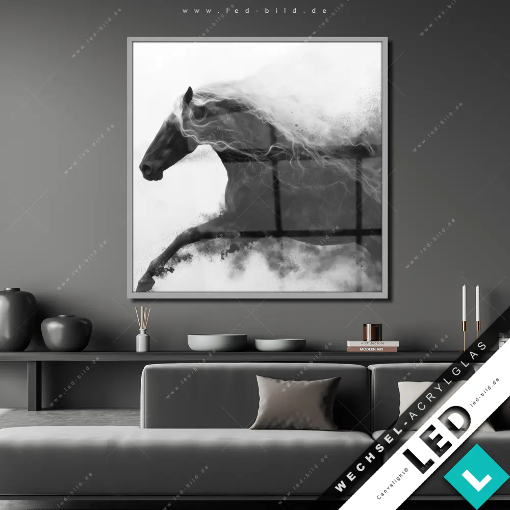 Canvalight® Wechsel-Acrylglas | Schwarzes Pferd voller Energie | Quadrat