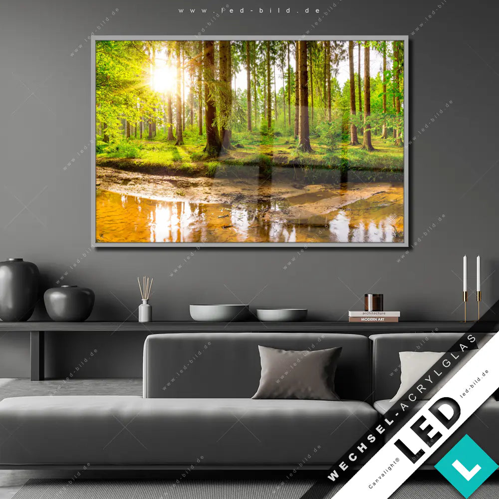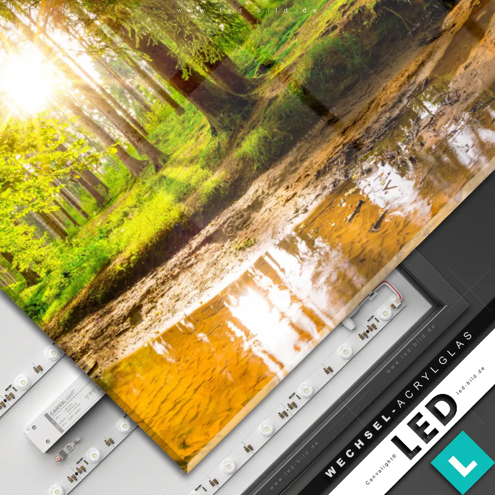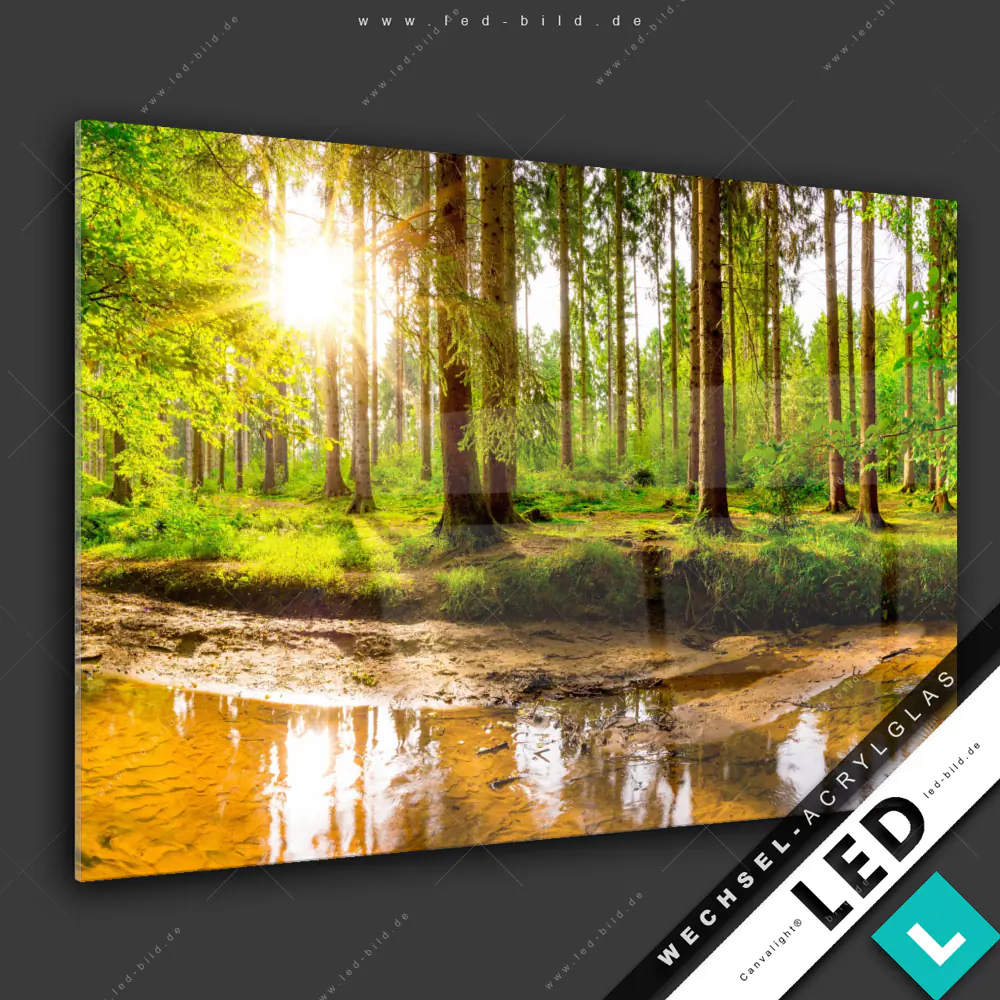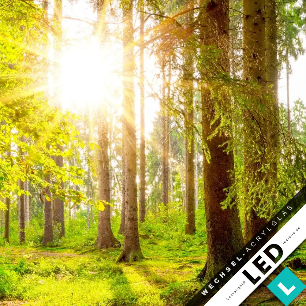 Canvalight® Wechsel-Acrylglas | Sonne im grünen Wald | Querformat