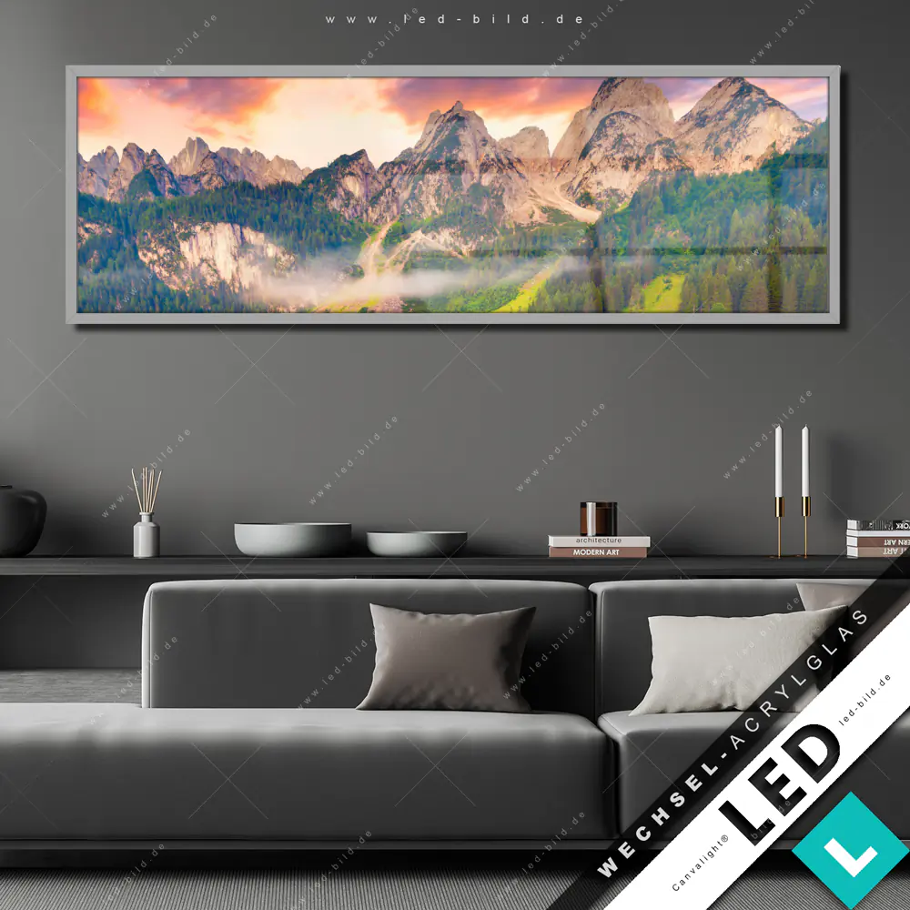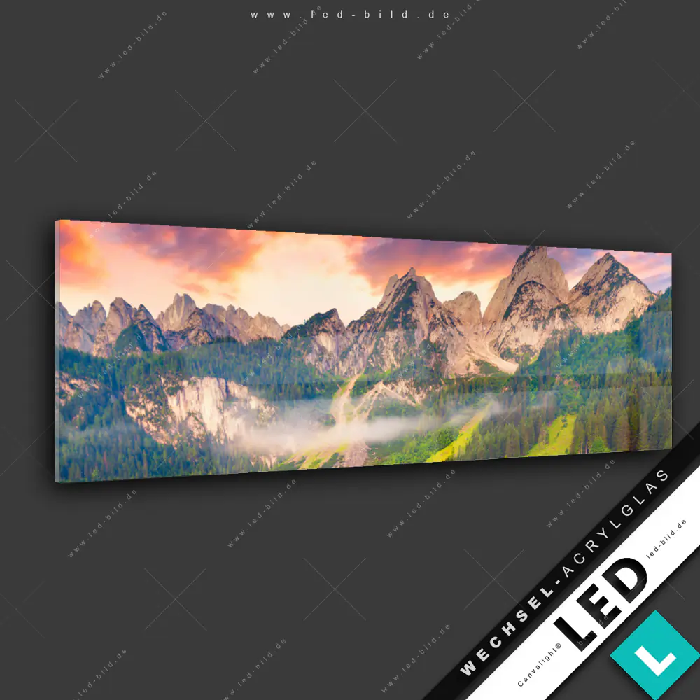 Canvalight® Wechsel-Acrylglas | Sonnenaufgang am Bergsee | Panorama