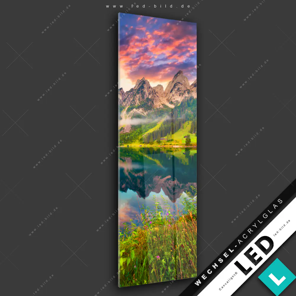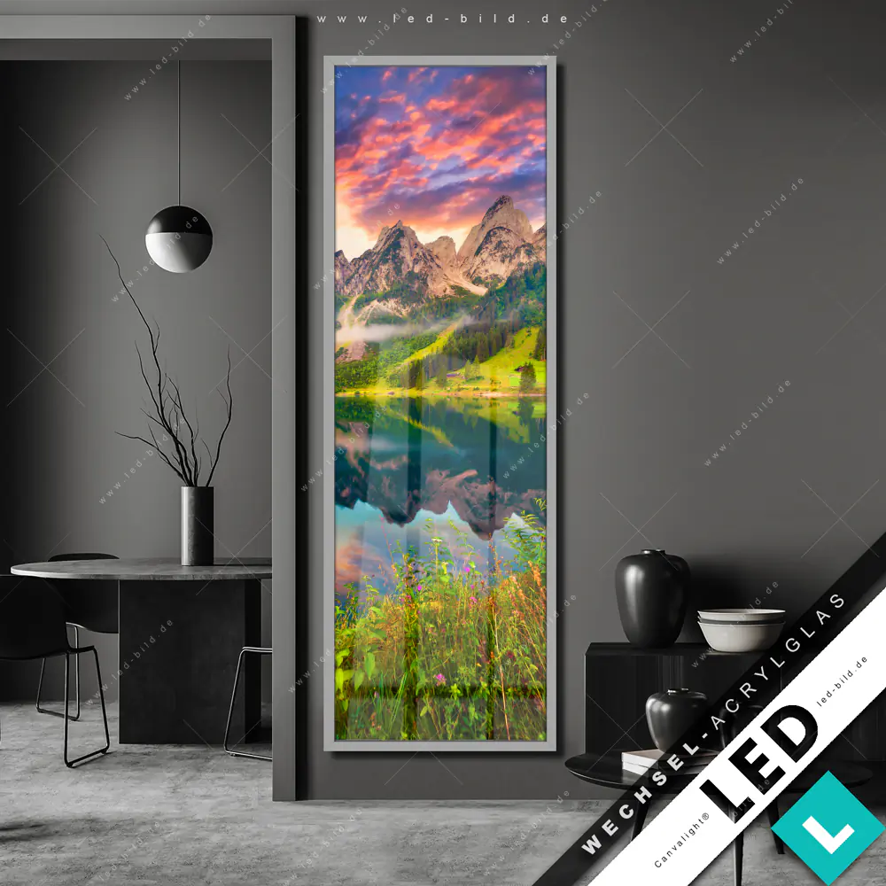 Canvalight® Wechsel-Acrylglas | Sonnenaufgang am Bergsee | Schmal