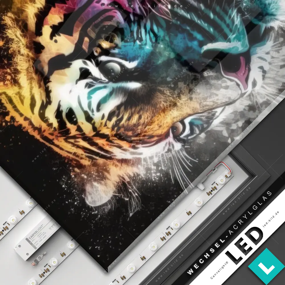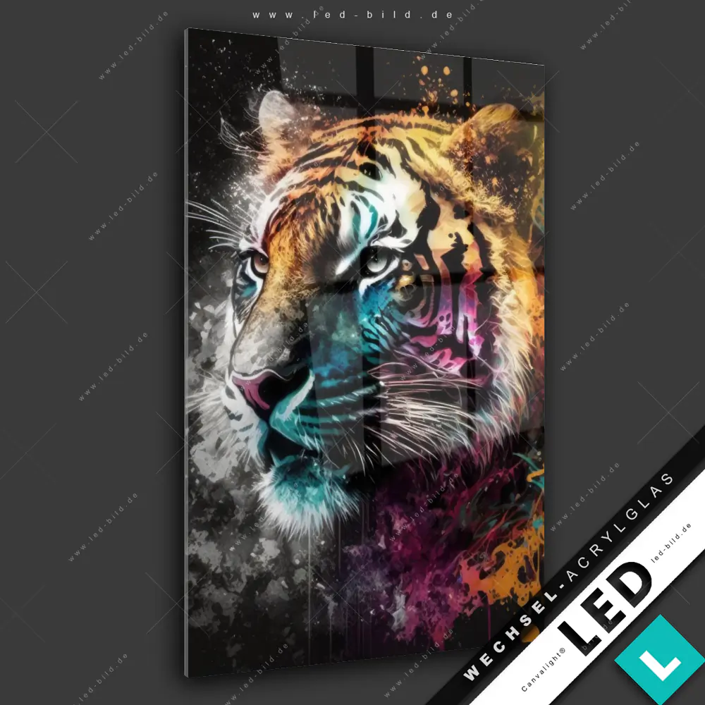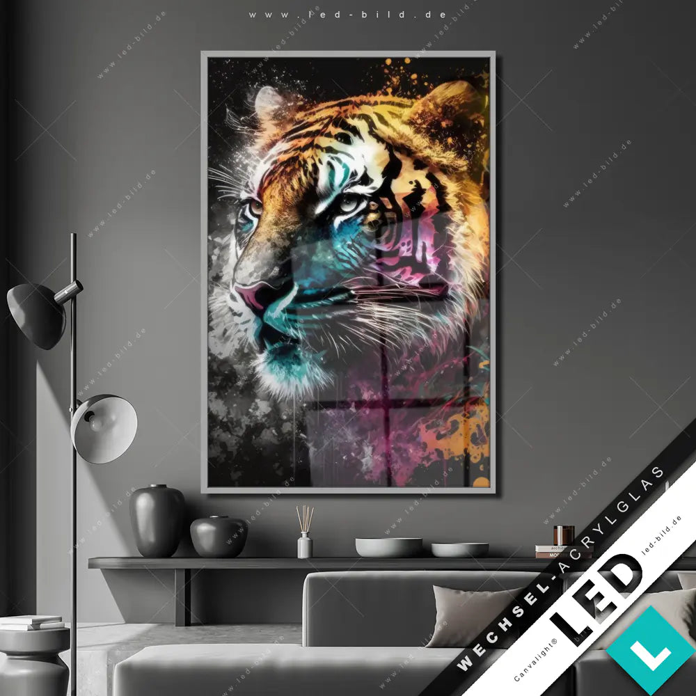 Canvalight® Wechsel-Acrylglas | Tiger im Farbrausch | Hochformat