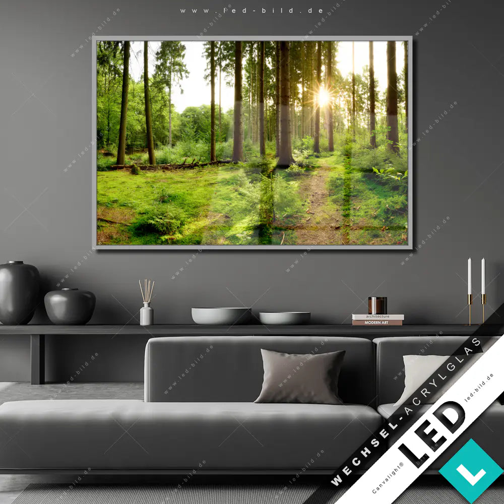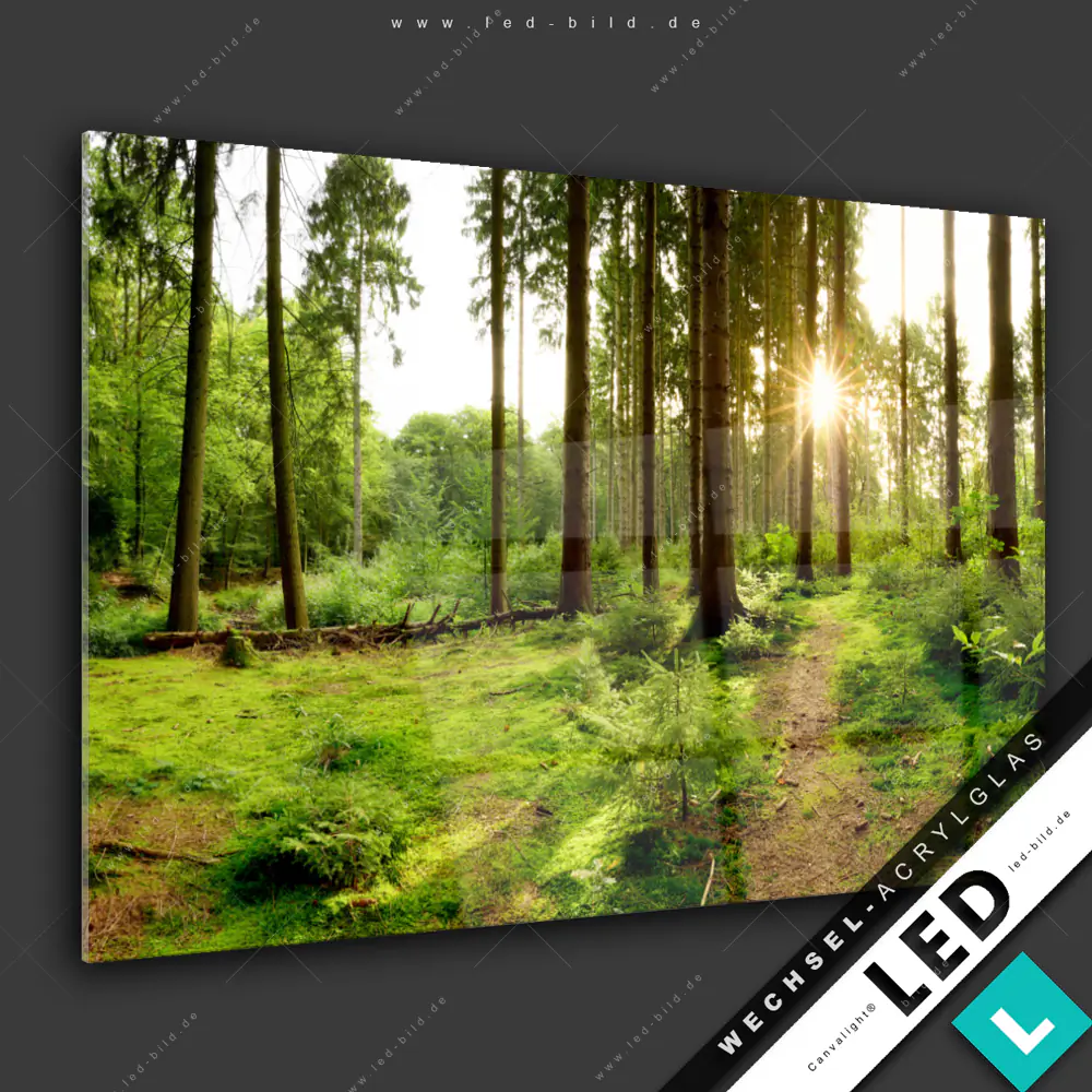 Canvalight® Wechsel-Acrylglas | Wald mit Sonnenstrahlen No.2 | Querformat