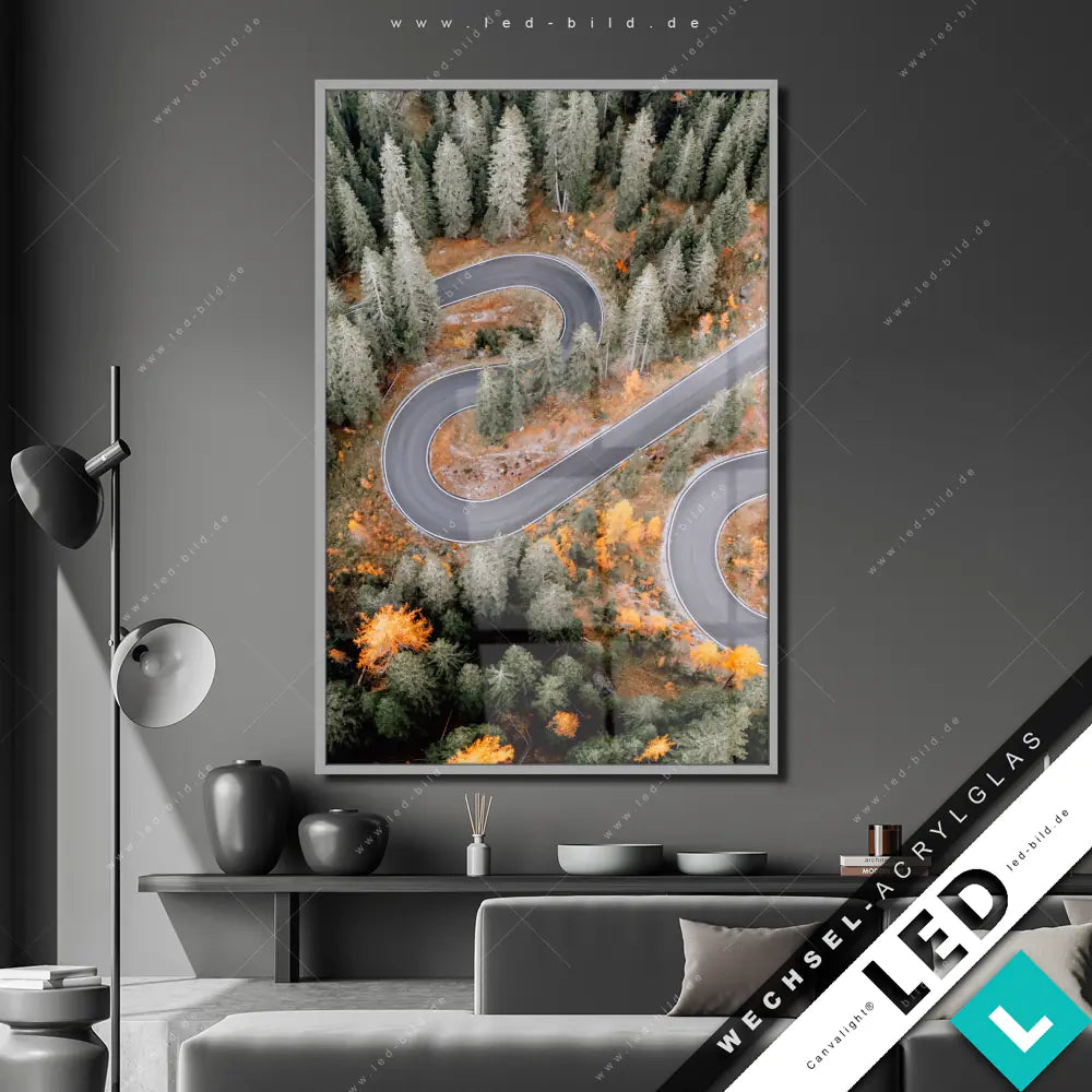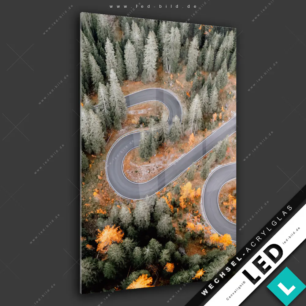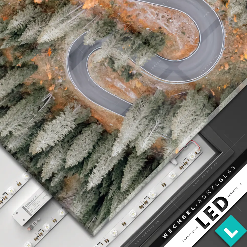 Canvalight® Wechsel-Acrylglas | Wald & Straße von oben | Hochformat