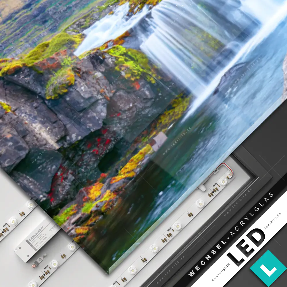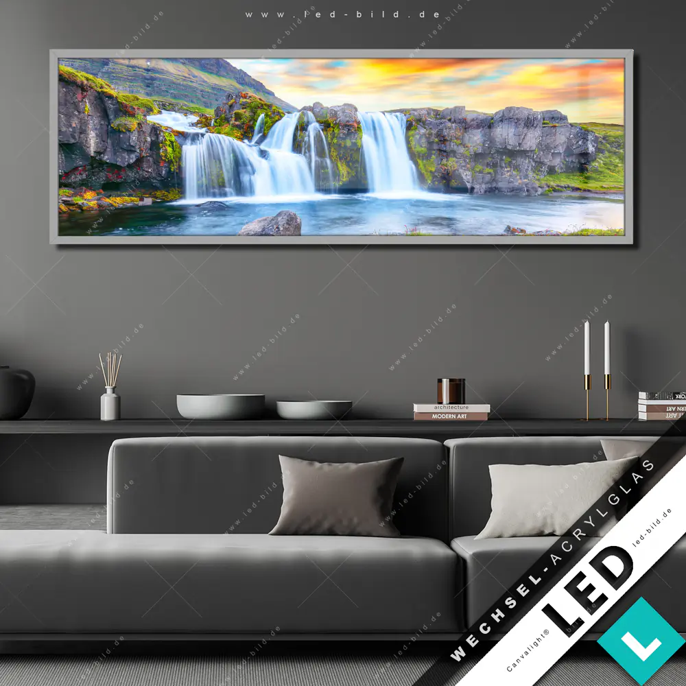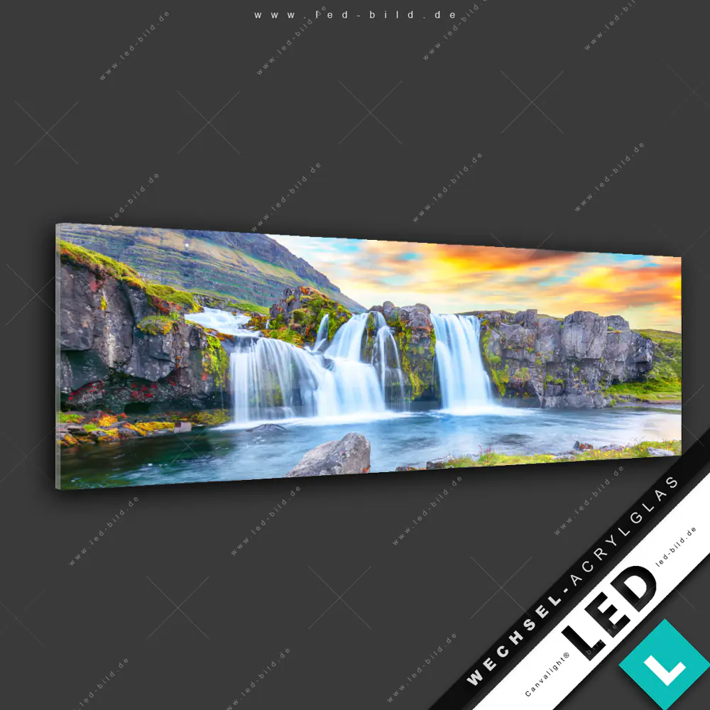 Canvalight® Wechsel-Acrylglas | Wasserfall bei Sonnenuntergang | Panorama