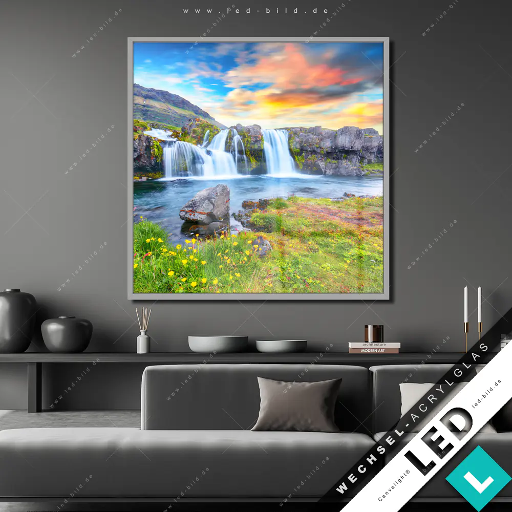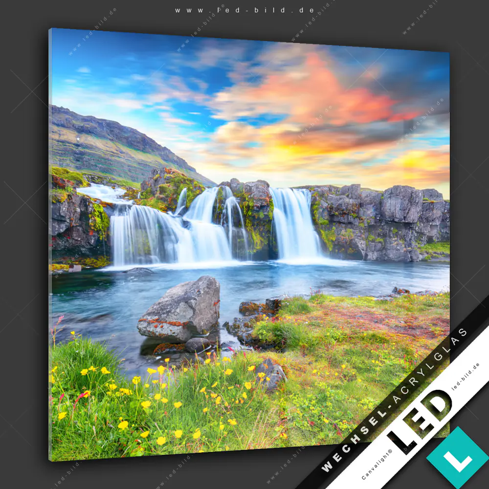 Canvalight® Wechsel-Acrylglas | Wasserfall bei Sonnenuntergang | Quadrat