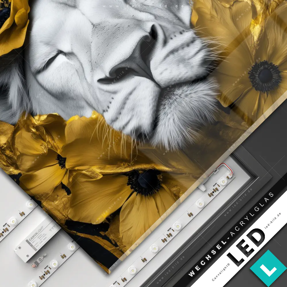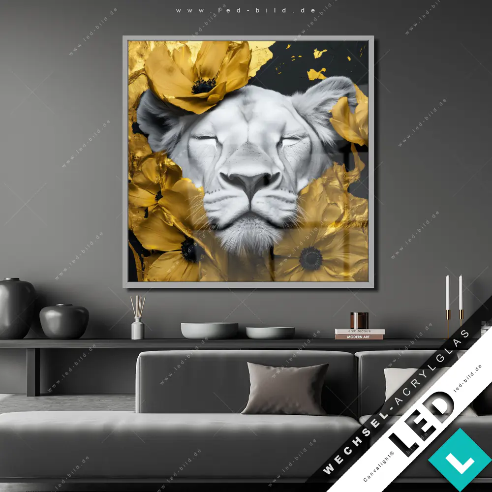 Canvalight® Wechsel-Acrylglas | Weiße Löwin mit Goldblüten | Quadrat