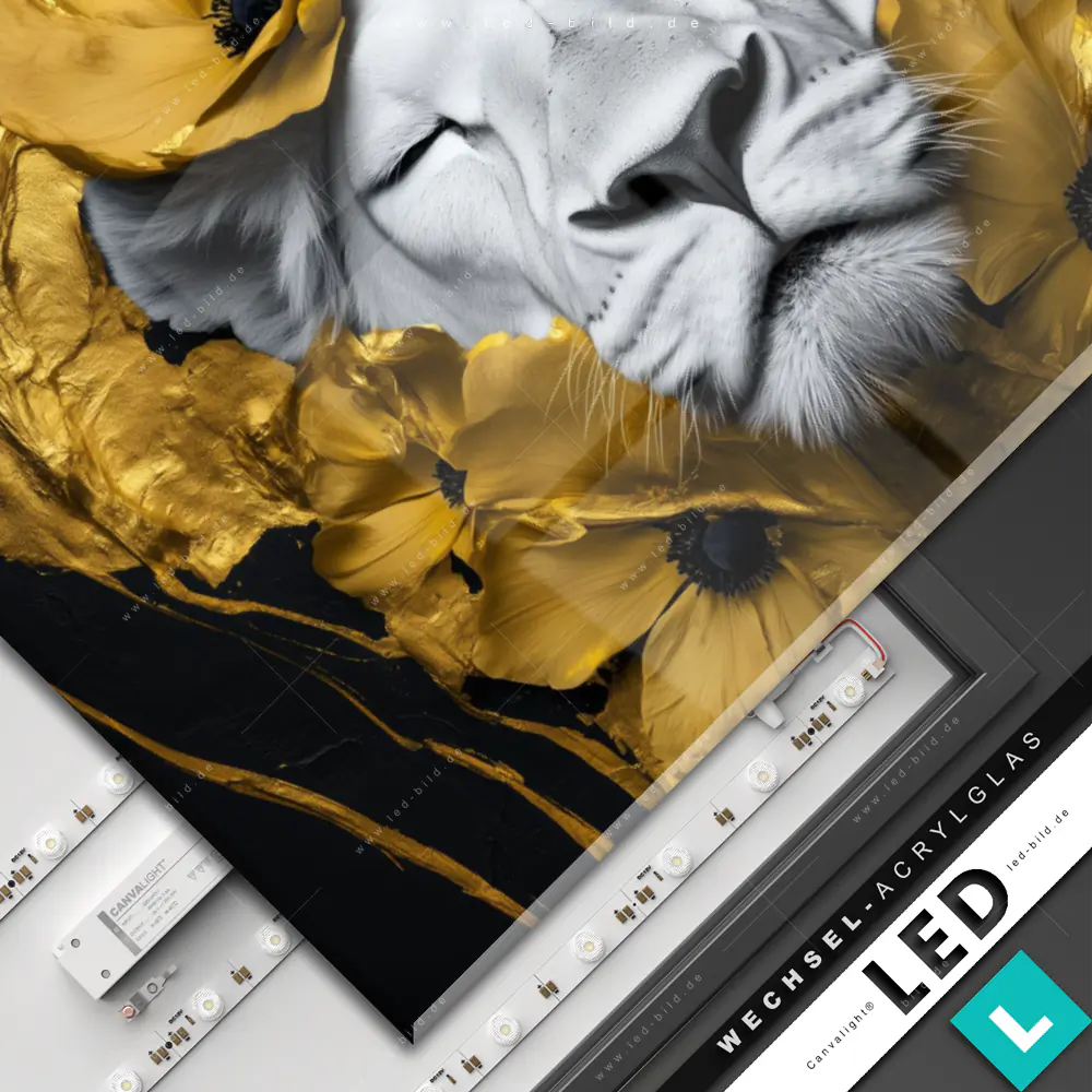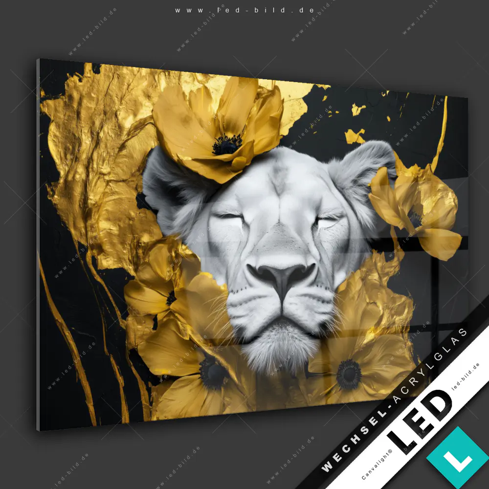 Canvalight® Wechsel-Acrylglas | Weiße Löwin mit Goldblüten | Querformat