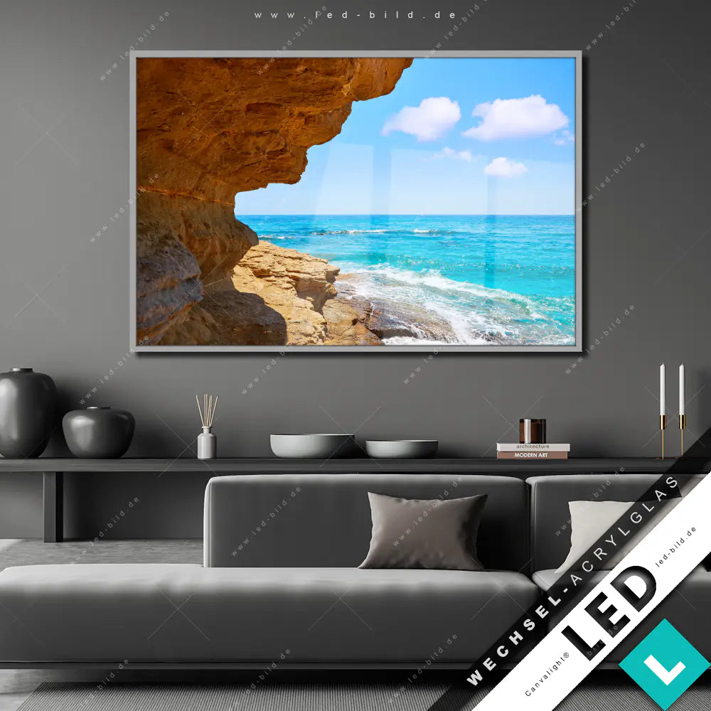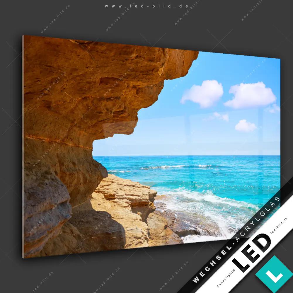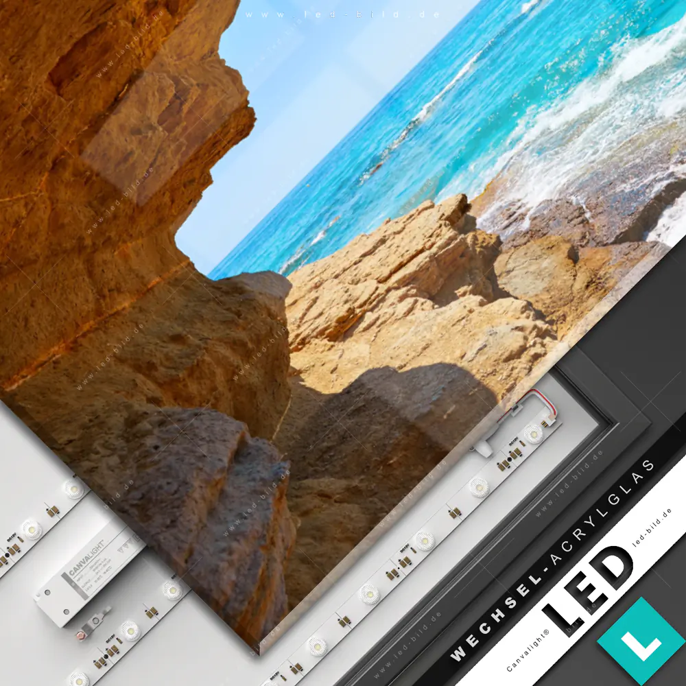 Canvalight® Wechsel-Acrylglas | Wellenrauschen und Felsenklippe | Querformat