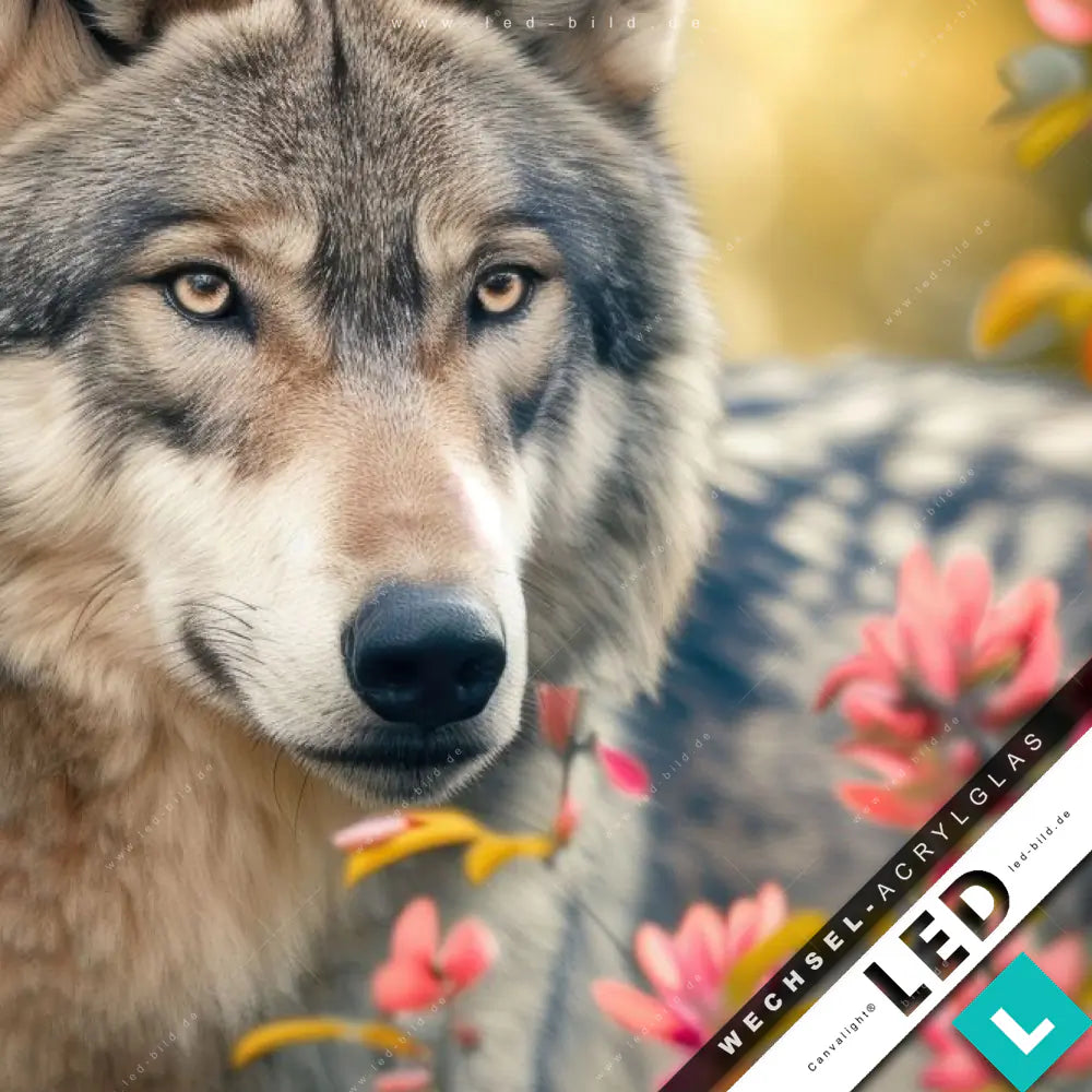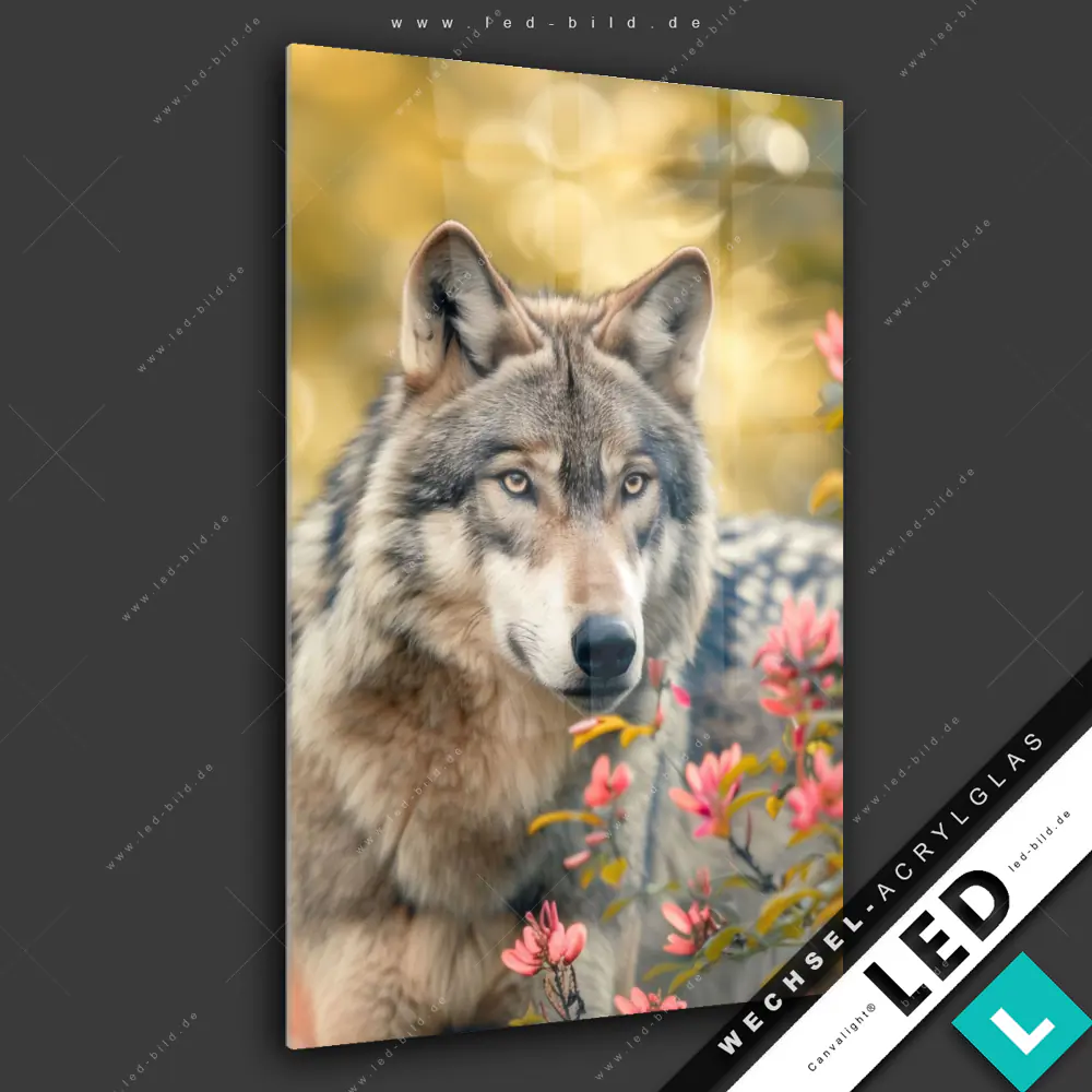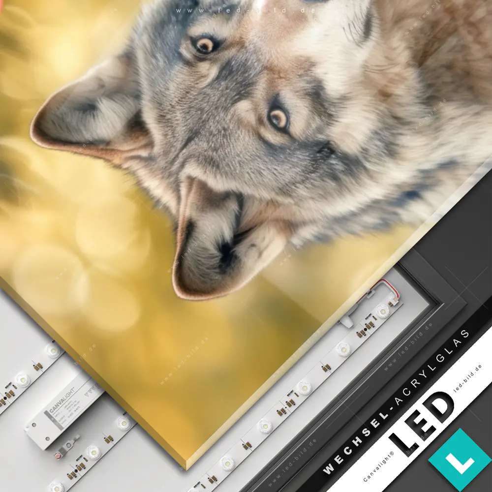 Canvalight® Wechsel-Acrylglas | Wolfsblick im Frühling | Hochformat