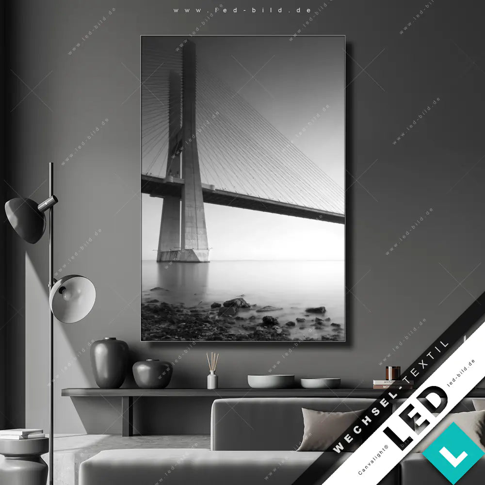Unser Austausch-Textildruck Architektur trifft auf Meer in den Farben Weiss, Schwarz, Grau verleiht deinem Textilrahmen Superkräfte und lässt ihn strahlen. Egal ob in Wohnzimmer - Schlafzimmer, Büro - Kanzlei, Flur - Eingangsbereich oder deinem persönlichen Rückzugsort – mit dem Ersatzdruck Faszinierende Brücke am Wasser für Spannrahmen-Bilder und beleuchtete Wandbilder wird deine Umgebung zum einzigartigen Erlebnis.
