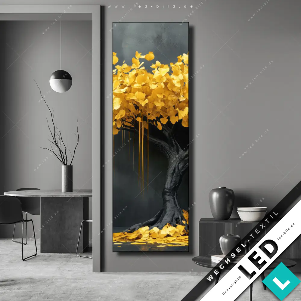 Lass dich vom trendigen Abstrakt, Minimalistisch Stil des Wechselmotivs Fallende Goldblätter und den faszinierenden Details wie Wald, Natur, Herbst, Baum, Stille, Blätter, Zweig begeistern. Gönn dir das Wald - Bäume, Blumen - Botanik Wechselmotiv deiner Träume und erlebe dein beleuchtetes Wandbild in neuem Licht!