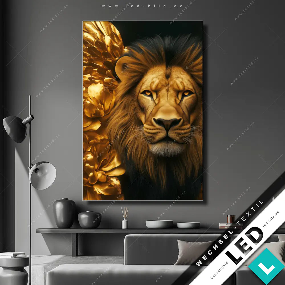 Aber Achtung, Suchtgefahr! Das Wechselmotiv Raubkatze im Goldglanz im trendigen Modern Art, Floral Stil mit Details wie Raubkatze, Löwe, Afrika, Dschungel, Lion, Blumen, Blüten, Tierporträt, Flügel zieht alle Blicke auf sich. Worauf wartest du noch? Hol dir dein Tierwelt, Blumen - Botanik Wechselmotiv und lass dein LED-Wandbild zum absoluten Highlight werden!