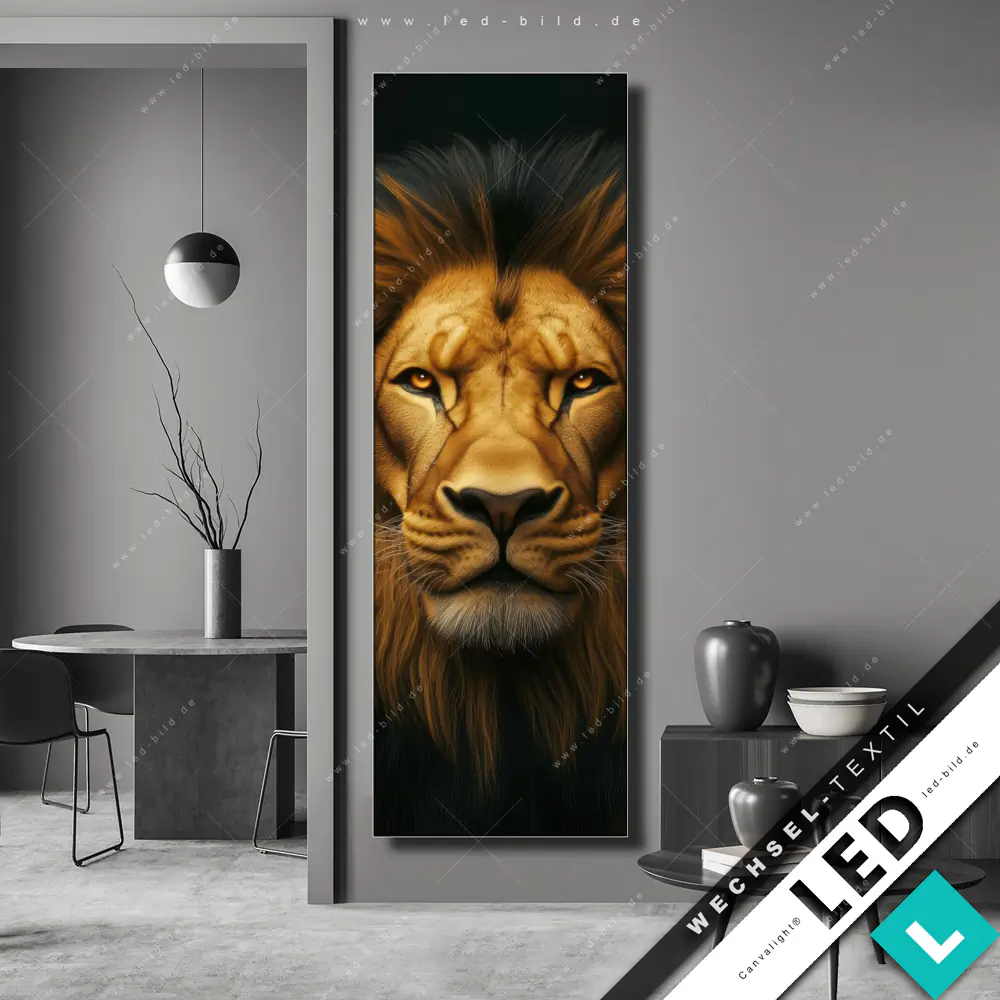 Verleihe deinem Spann- oder LED Bild einen neuen Look mit dem angesagten Wechselmotiv Goldener Löwe im Schmalen Format. Die atemberaubenden Farben Braun, Gold, Schwarz machen dein Wandbild zum Star in jedem Raum!