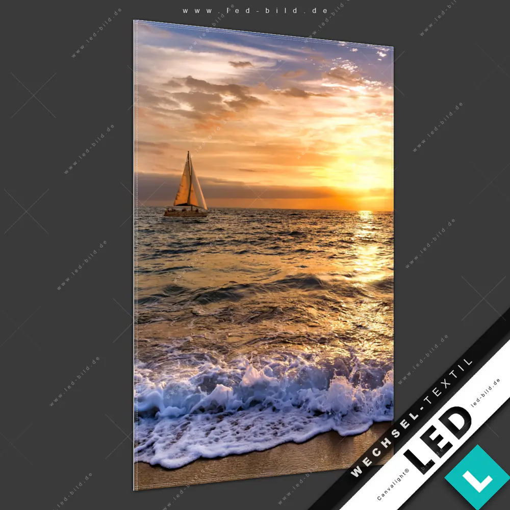 Aber Achtung, Suchtgefahr! Das Wechselmotiv Wellenrauschen und Abendrot im trendigen Natürlich - Realistisch, Modern Art Stil mit Details wie Ostsee, Nordsee, Sonnenaufgang, Urlaub, Abenddämmerung, Sonnenuntergang, Boot, Segelboot, segeln, Meer, Wellen zieht alle Blicke auf sich. Worauf wartest du noch? Hol dir dein Landschaften, Strand - Meer Wechselmotiv und lass dein LED-Wandbild zum absoluten Highlight werden!