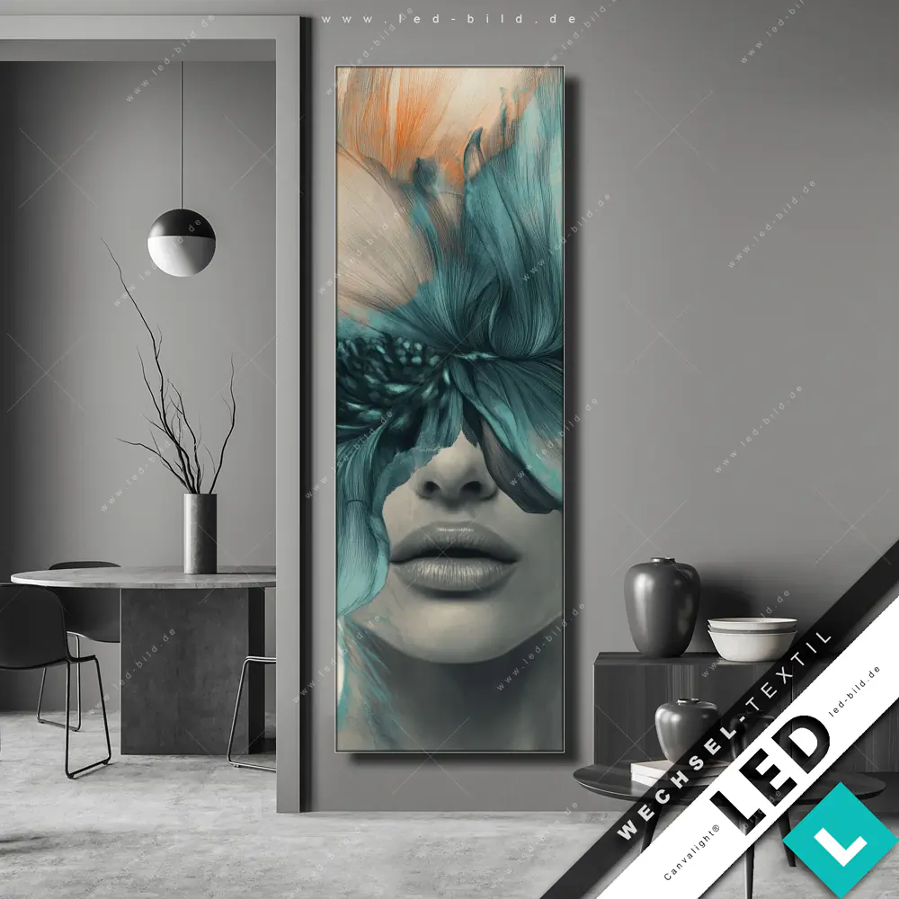 Verleihe deinem Spann- oder LED Bild einen neuen Look mit dem angesagten Wechselmotiv Verhüllte Schönheit im Schmalen Format. Die atemberaubenden Farben Orange, Beige, Türkis machen dein Wandbild zum Star in jedem Raum!