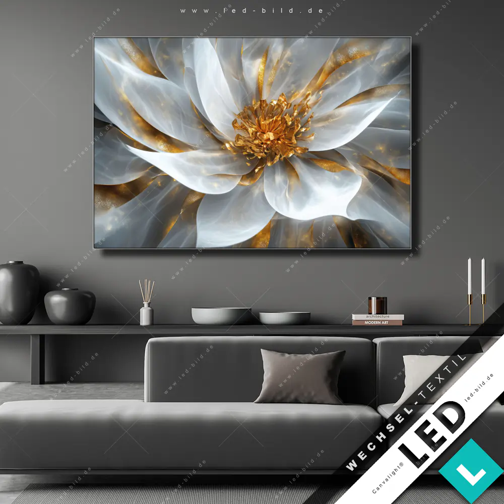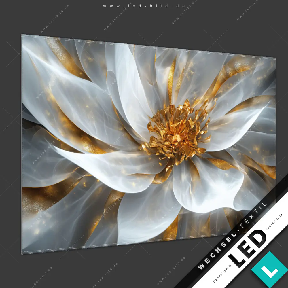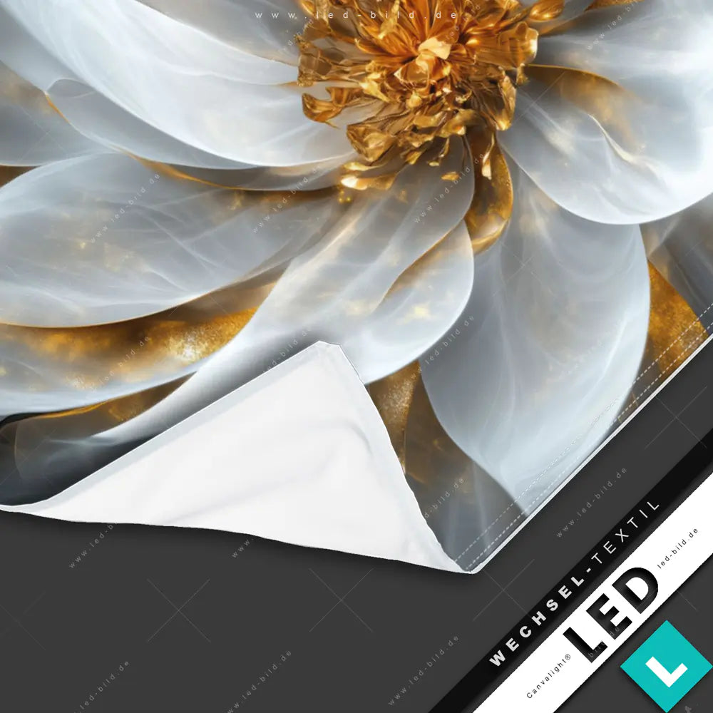 Lass deine Wände sprechen! Mit dem aufregenden Wechselmotiv Zarte Luxusblüte im Querformat verleihst du deinem Spannbild oder LED Bild einen einzigartigen Look. Der farbenfrohe Austausch-Textildruck in Weiss, Gold ist ein echter Blickfang für jeden Raum.